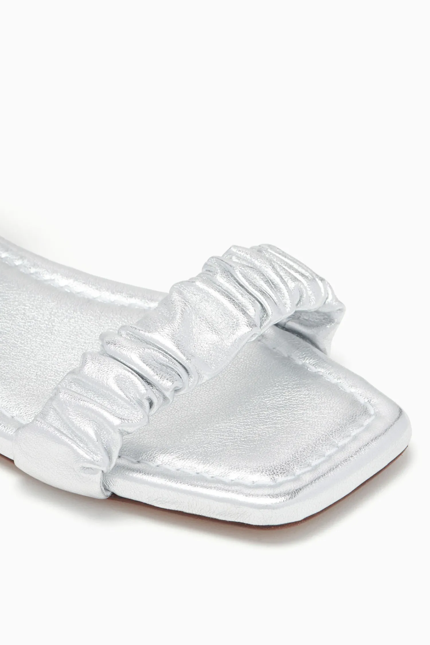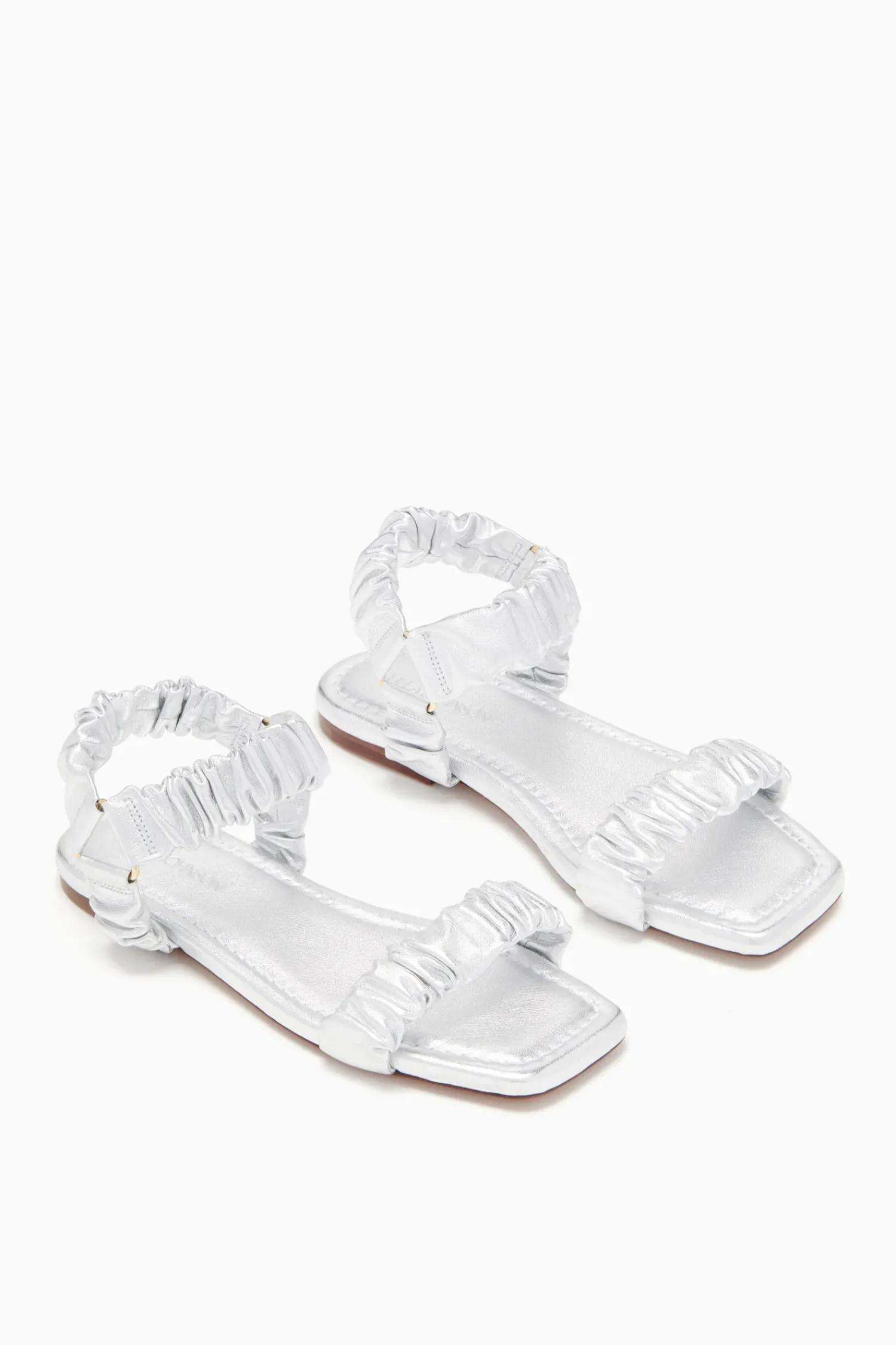 An Everyday Classic, The Isabella Ruched Flat Sandal Is Crafted From Supple Leather That’S Elegantly Ruched Throughout. It Is A Beautiful Silver Hue, Has An Open Square Toe, And Easily Slips On And Off.