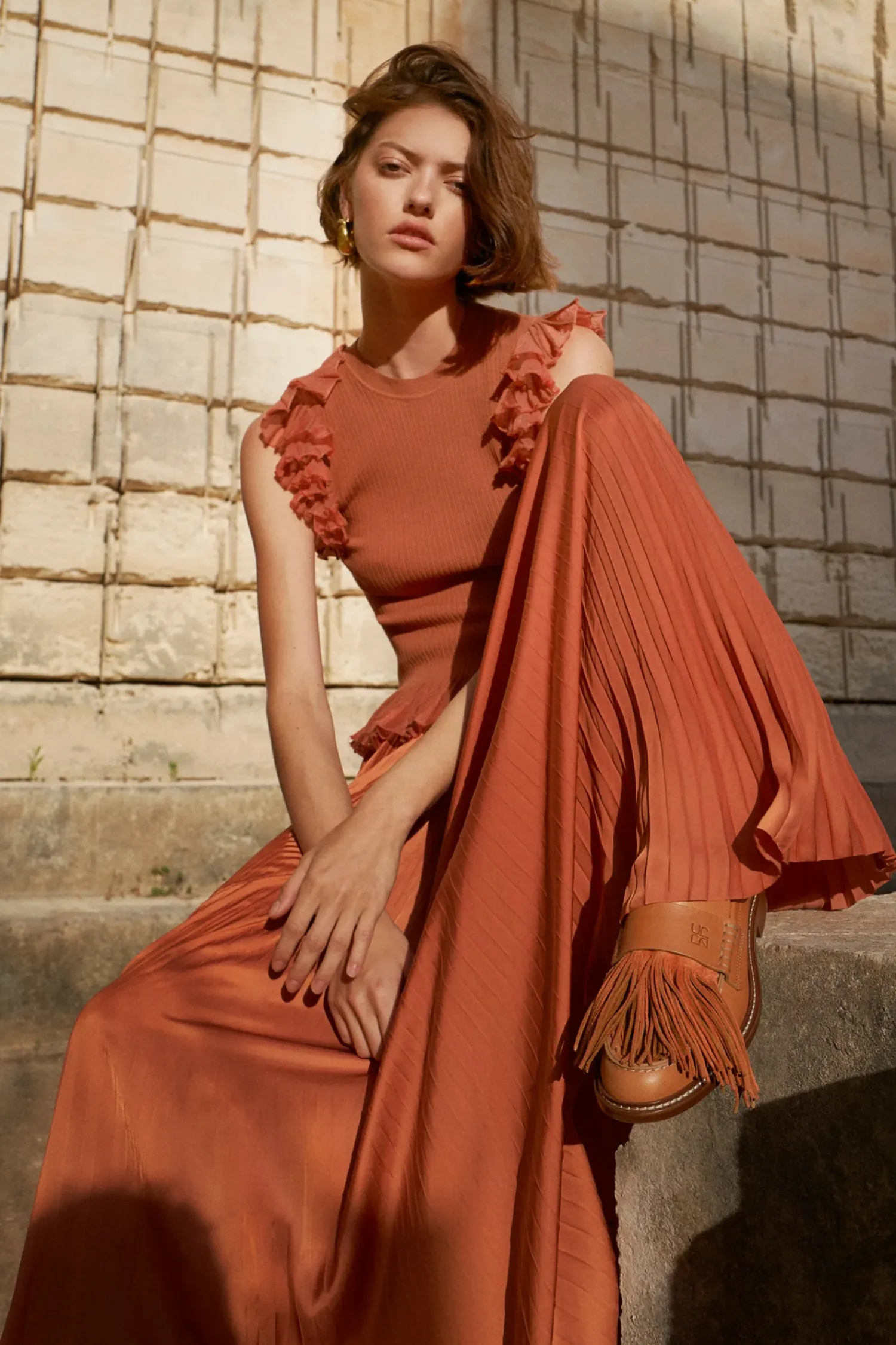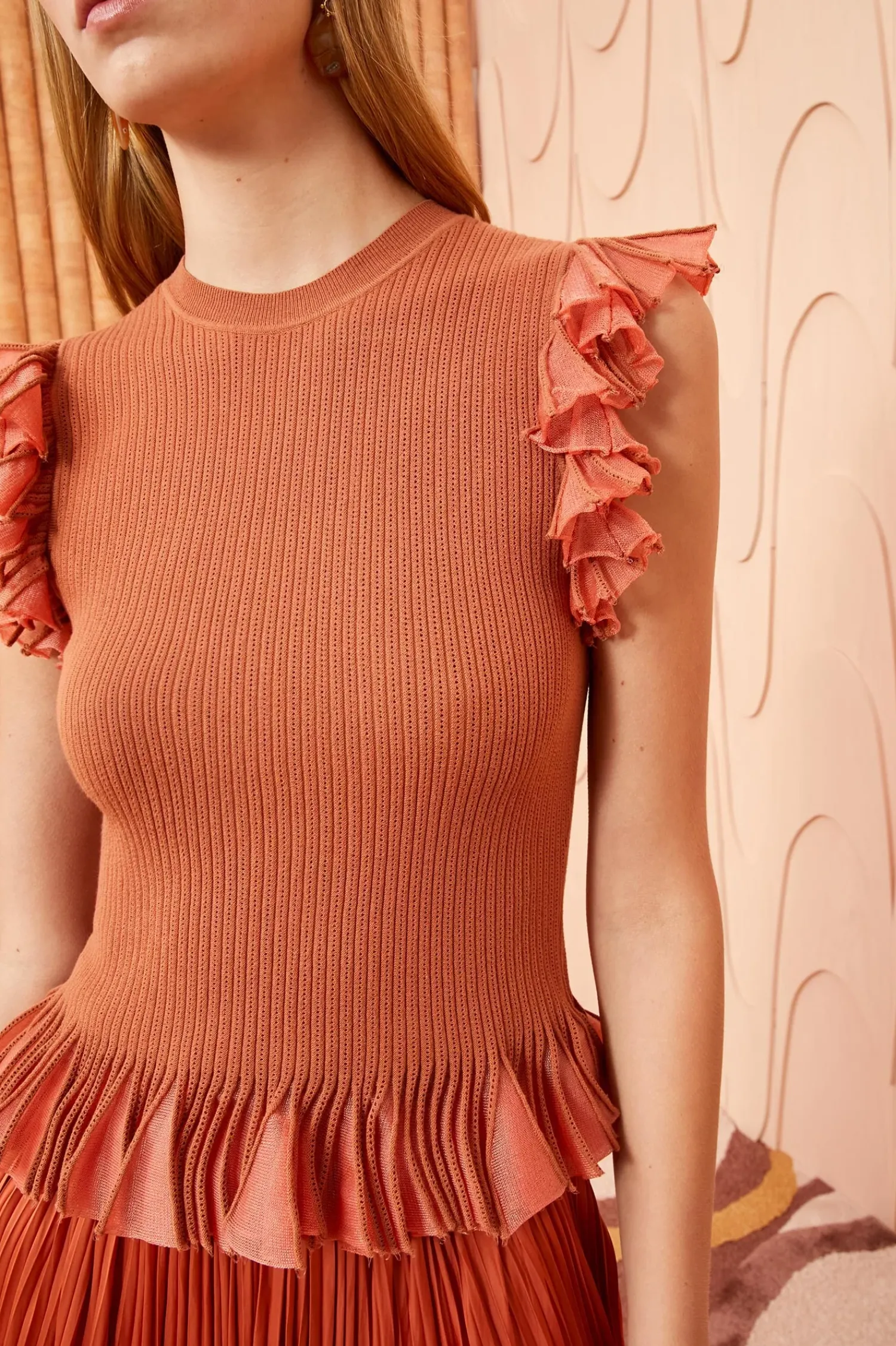 The Leila Top Is Made From Our Exquisite Ultrafine Sunburst Knit In A Beautiful Earthen Orange. It Features A Crewneck And Is Finished With Eye-Catching Flutters At The Sleeves And Hemline.