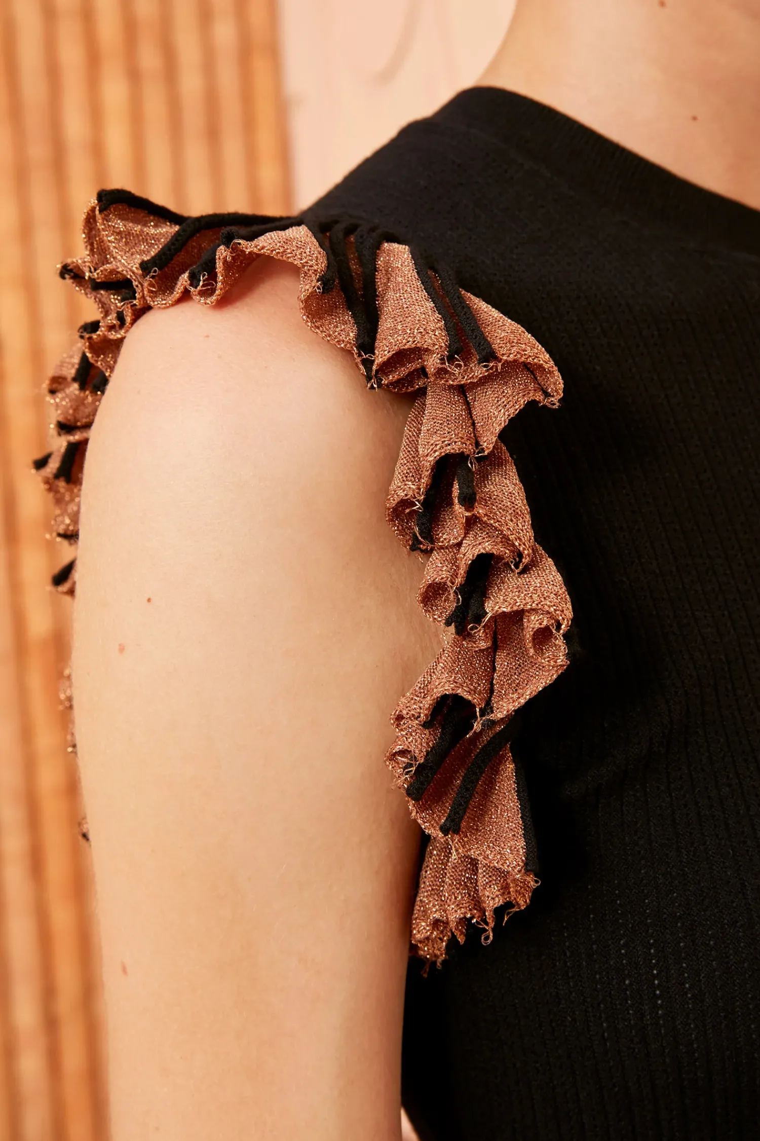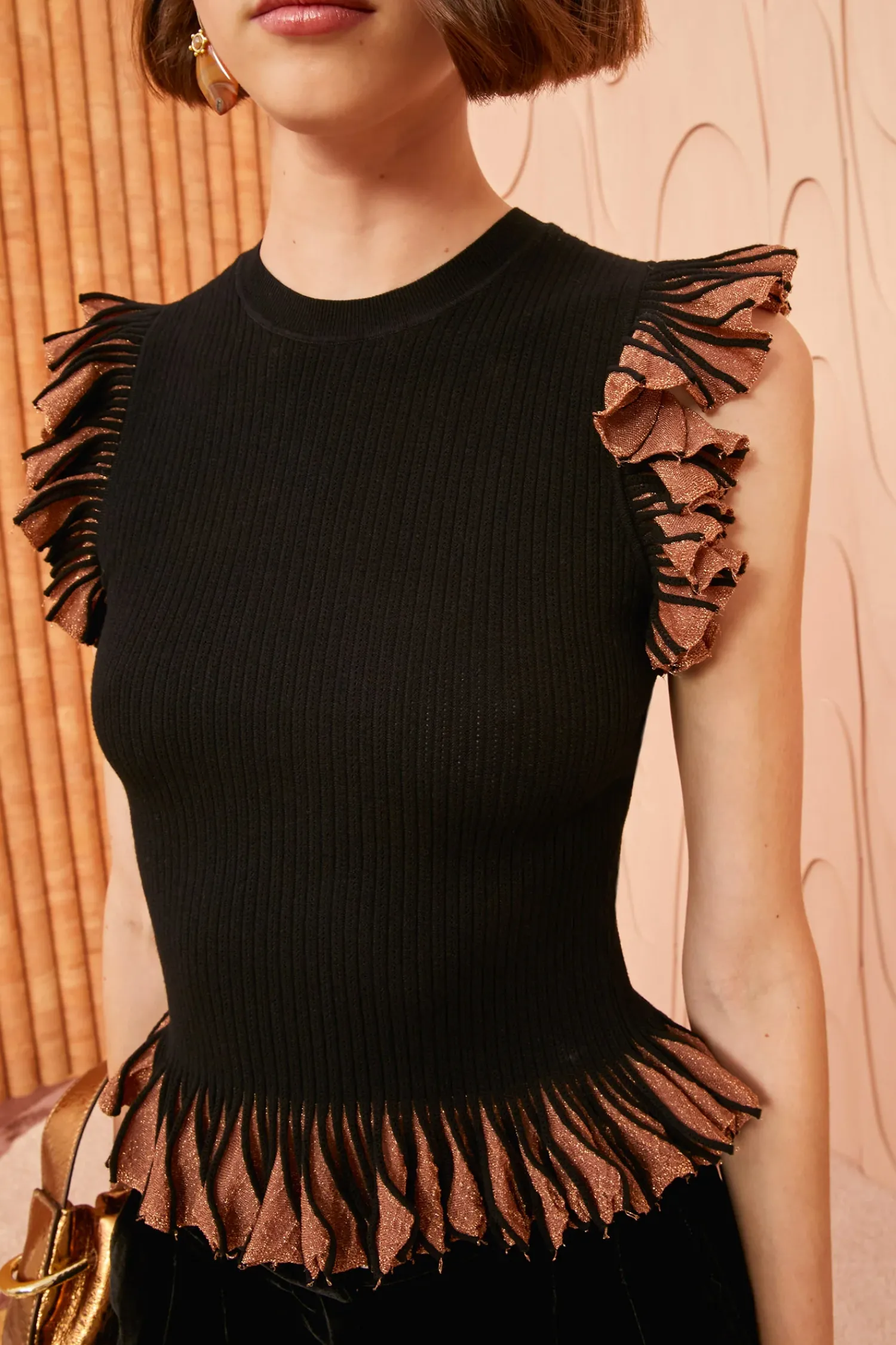 The Leila Top Is Made From Our Exquisite Ultrafine Sunburst Knit In Classic Svart. It Features A Crewneck, Eye-Catching Bronze Flutters At The Sleeves And Hemline, And Can Be Easily Paired With Our Emilia Skirt.