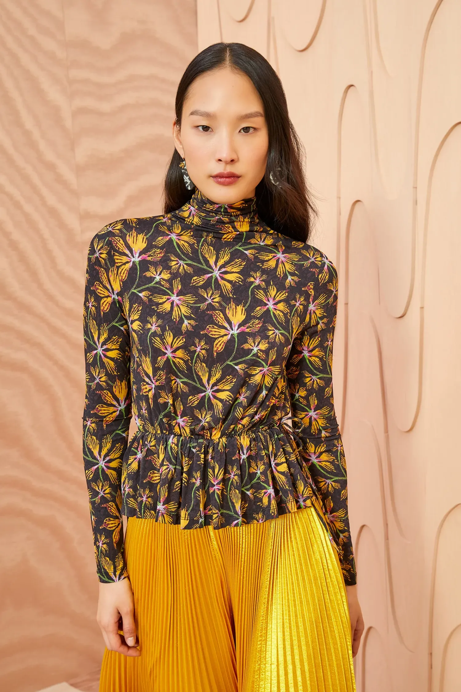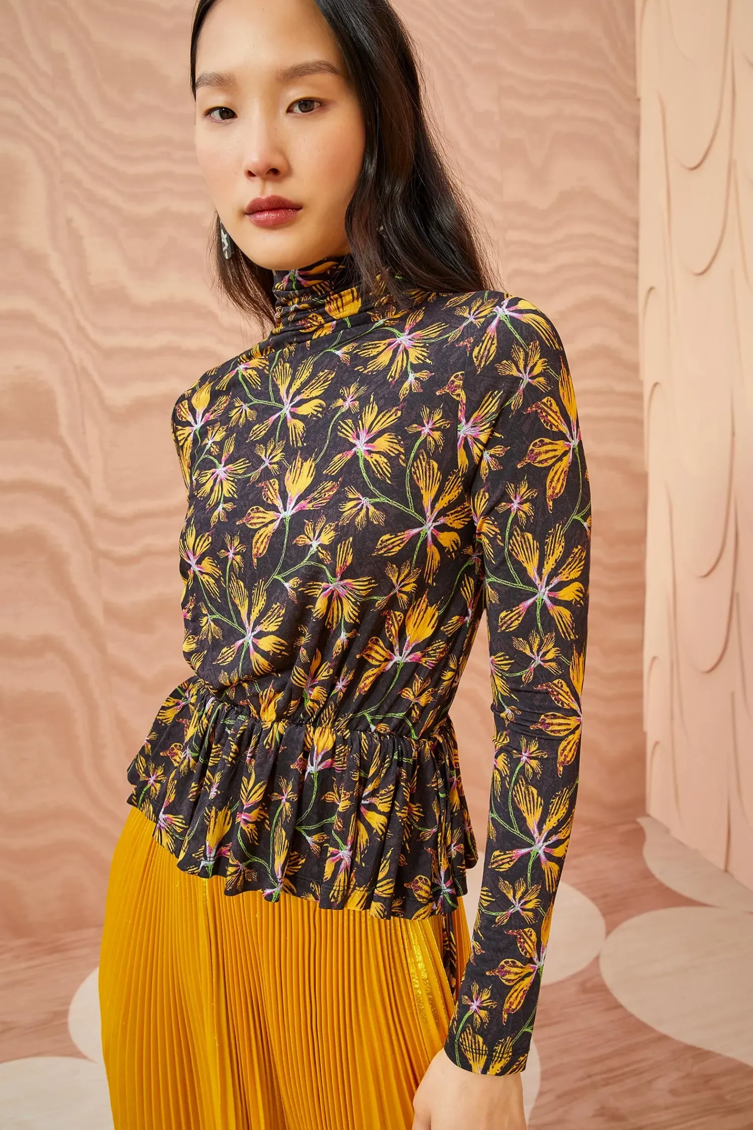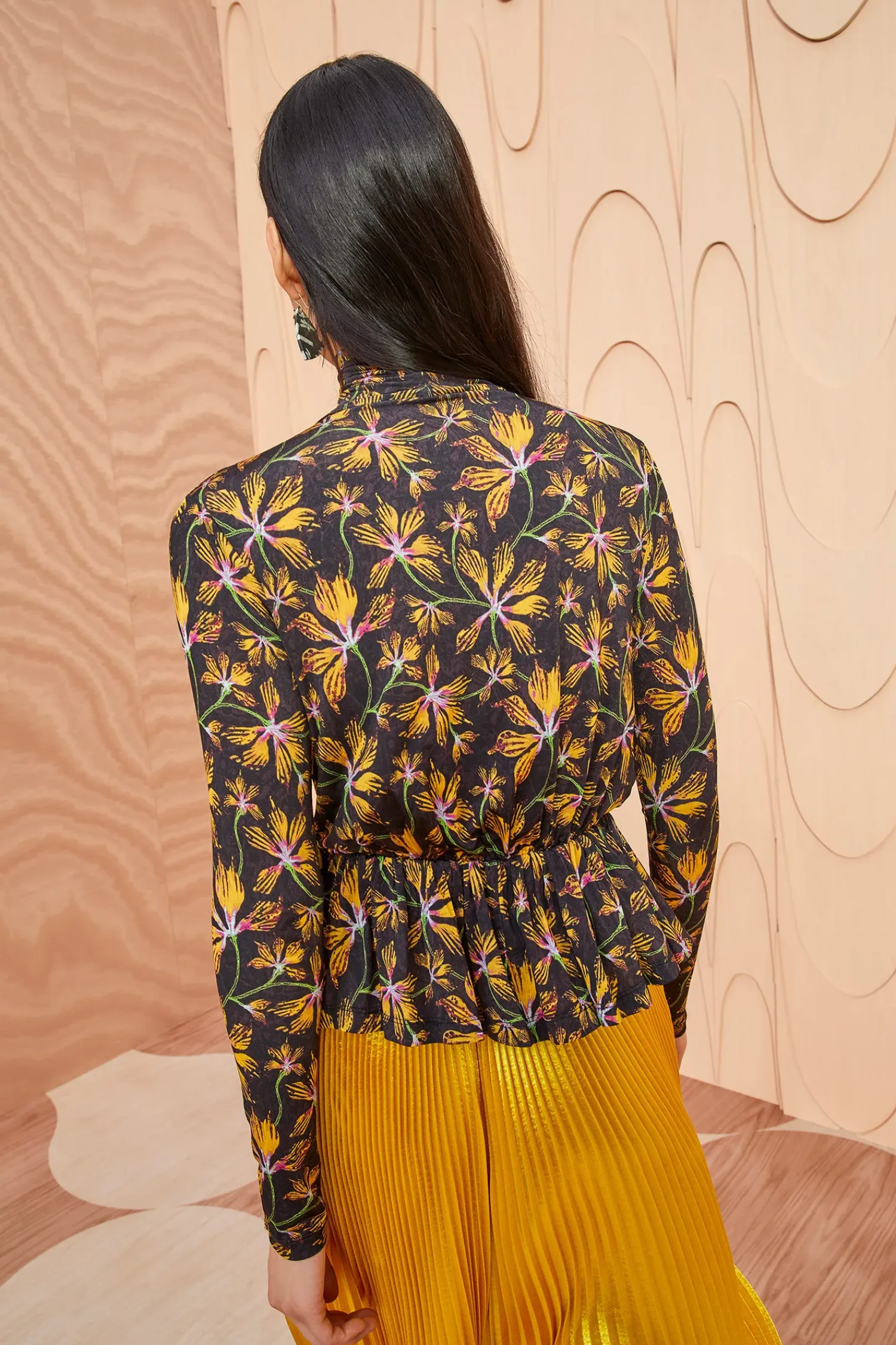 As Featured In Look 30 Of Our Autumn/Winter ’23 Runway Show, The Nina Top Is Made From Our Silken Draped Tricot Jersey And Printed In This Season’S Favorite Graphic Florals With Pops Of Yellow And Pink. This Lightweight Long-Sleeve Top Features A Ruched Waistband With Drawstring Ties And A Peplum Hem.