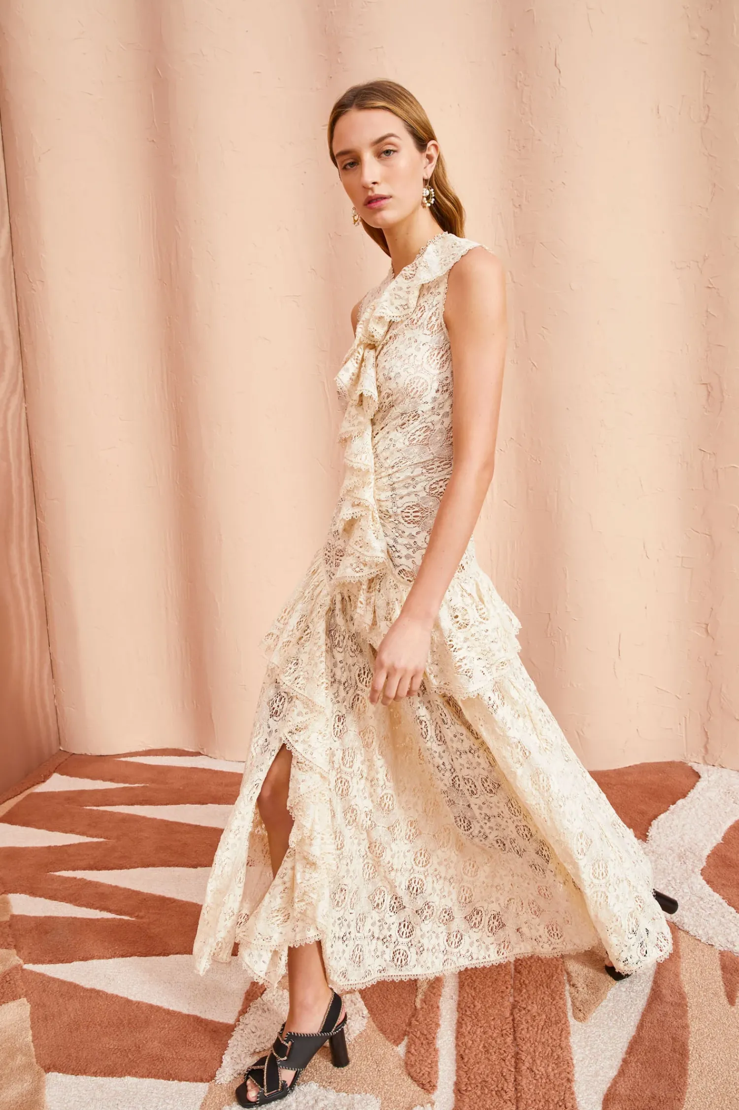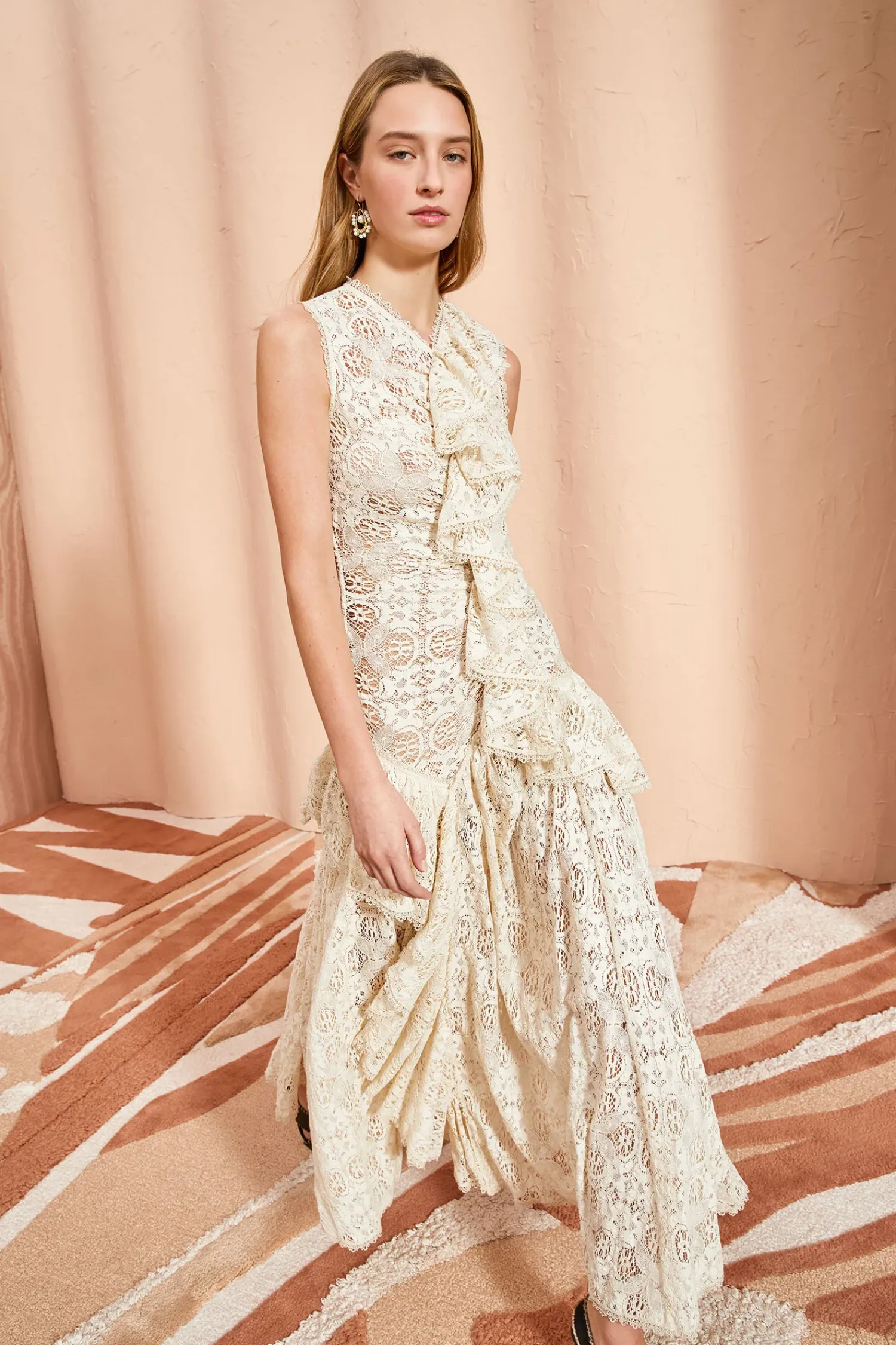 As Featured In Look 27 Of Our Pre-Fall ’23 Lookbook, The Odile Dress Is Made From Cotton Lace That Floats Against The Body In Layers Of Cascading Ruffles. Inspired By Antique Textiles, This Romantic Frock Features Floral And Butterfly Motifs And Is Detailed With Delicate Trim Along Each Edge. This Sleeveless White Maxi Dress Has A Smocked Bodice With A Cascading Ruffle Trailing From The Neckline To The Skirt. It Is Finished With Zipper Along The Back.