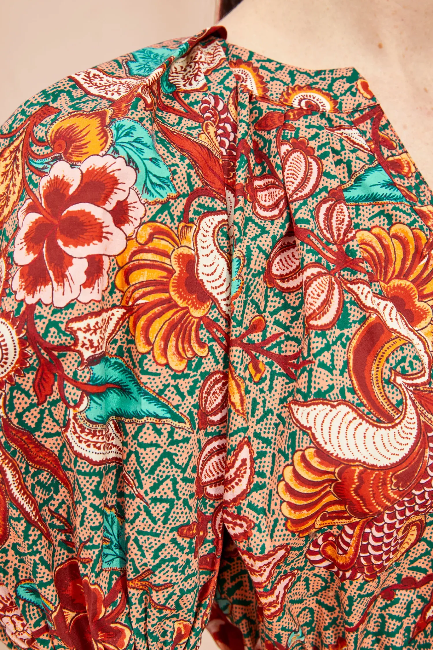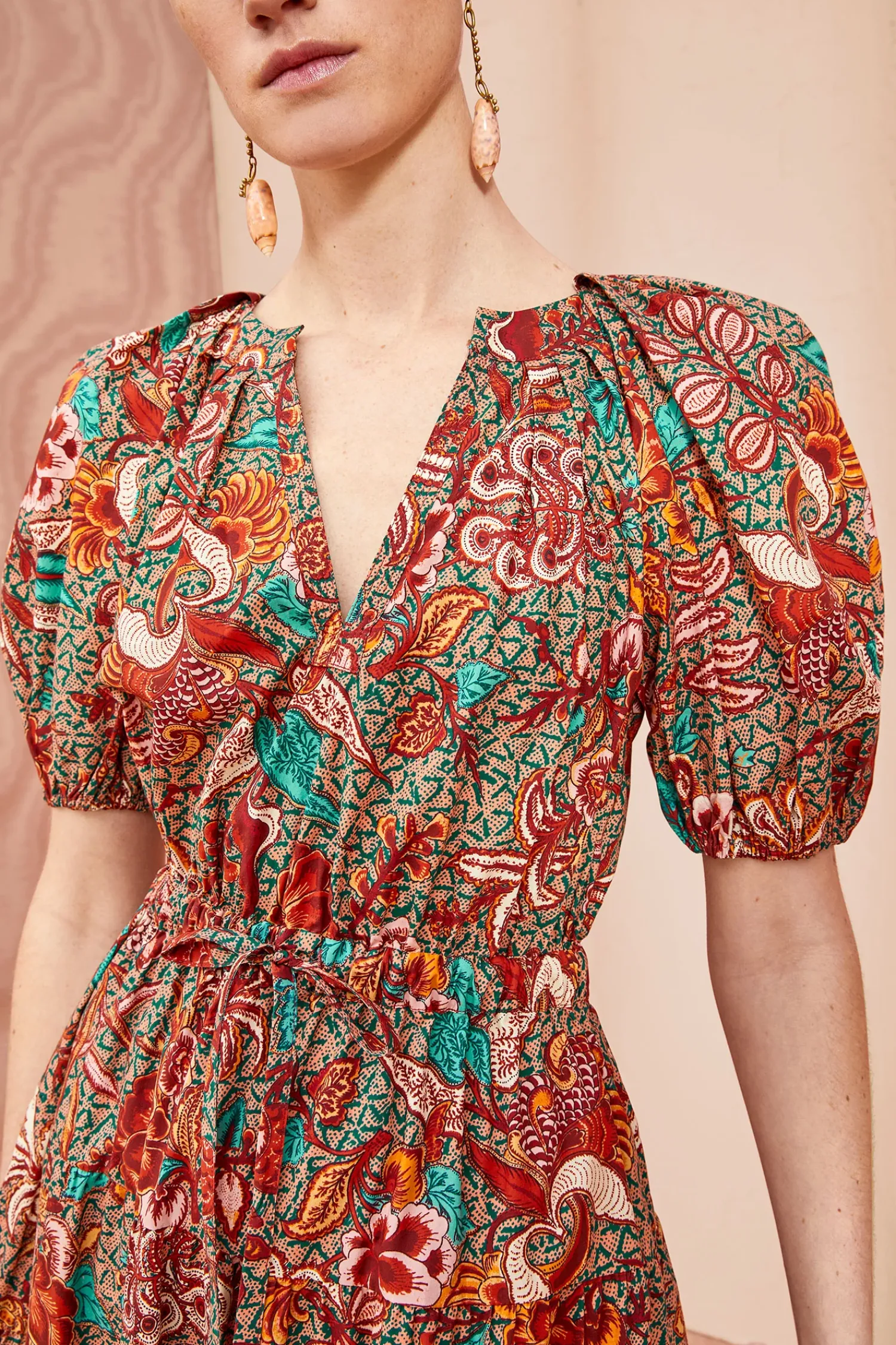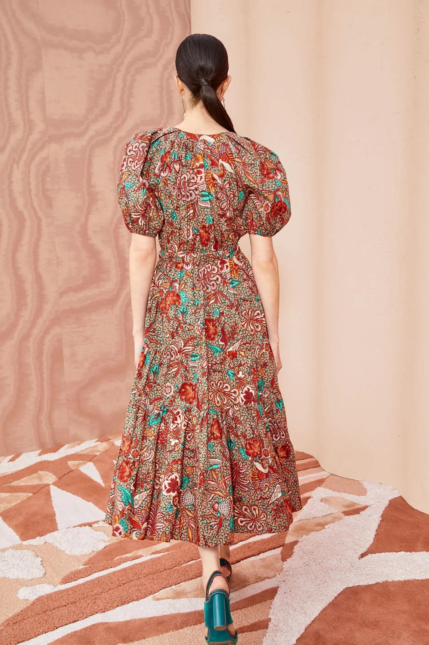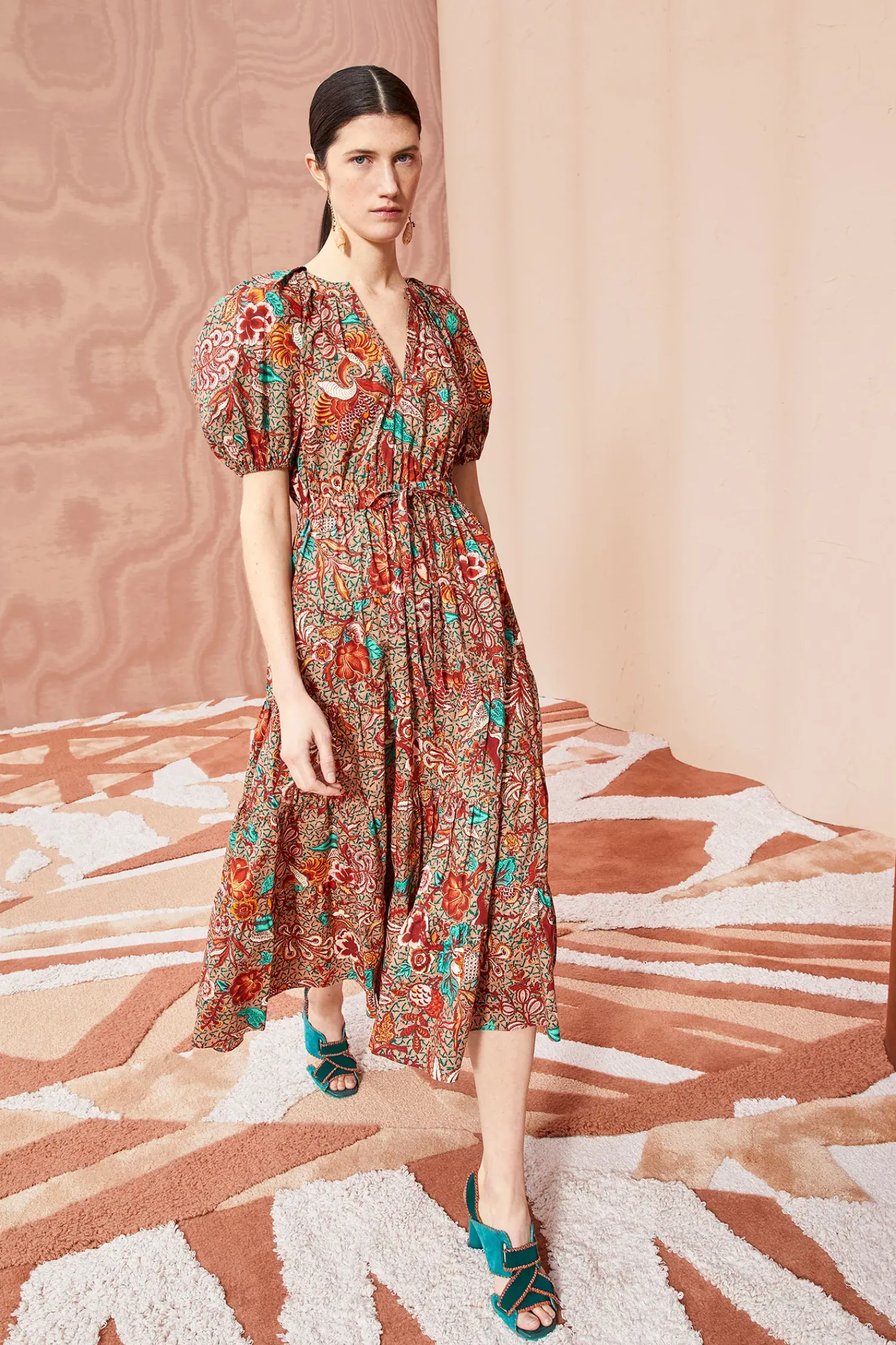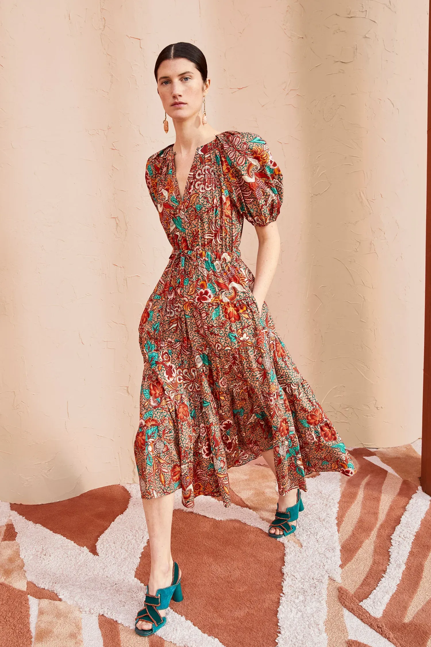The Olina Dress Is A Classic Ulla Johnson Silhouette, Defined By Cloud-Like Puff Sleeves And Its Split Open Neckline. This Midi-Length Dress Features A Bold Floral Motif Print With Pops Of Crimson And Turquoise On A Peach Background. Finished With A Drawstring Waist, A Tiered Skirt And Side-Seam Pockets, This Wear-Everywhere Frock Is Comfortably Unlined.
