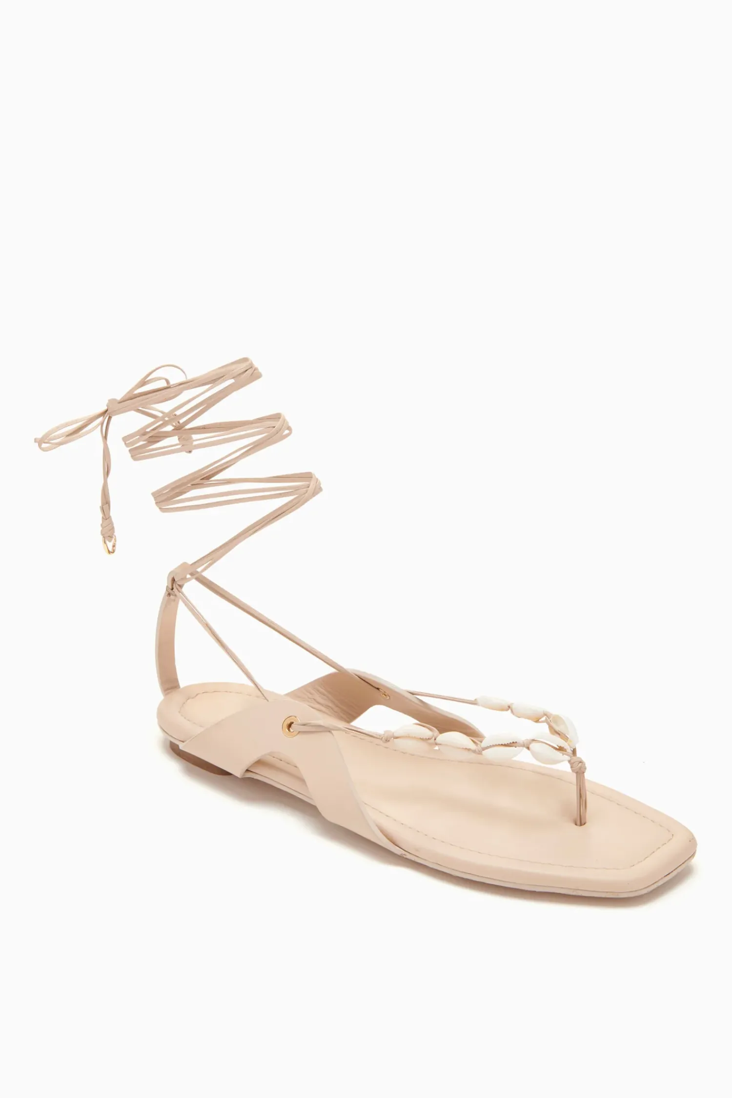 The Romina Shell Lace Up Sandal Is Crafted In Luxurious White Leather And Decorated With Cowrie Shells Along The Front. This Pristine Warm-Weather Shoe Is Finished With Delicate Leather Details That Tie Around The Ankle.