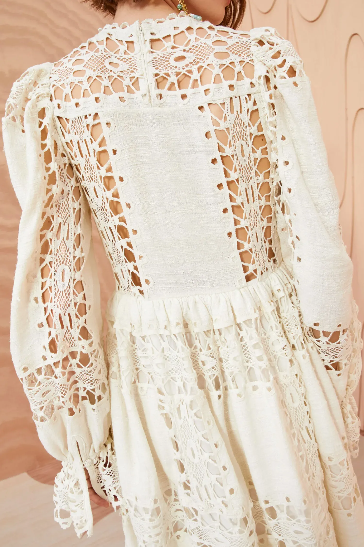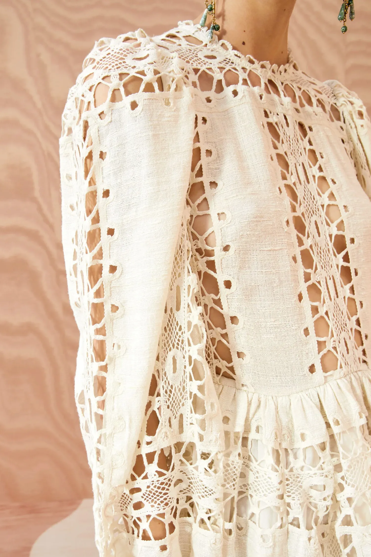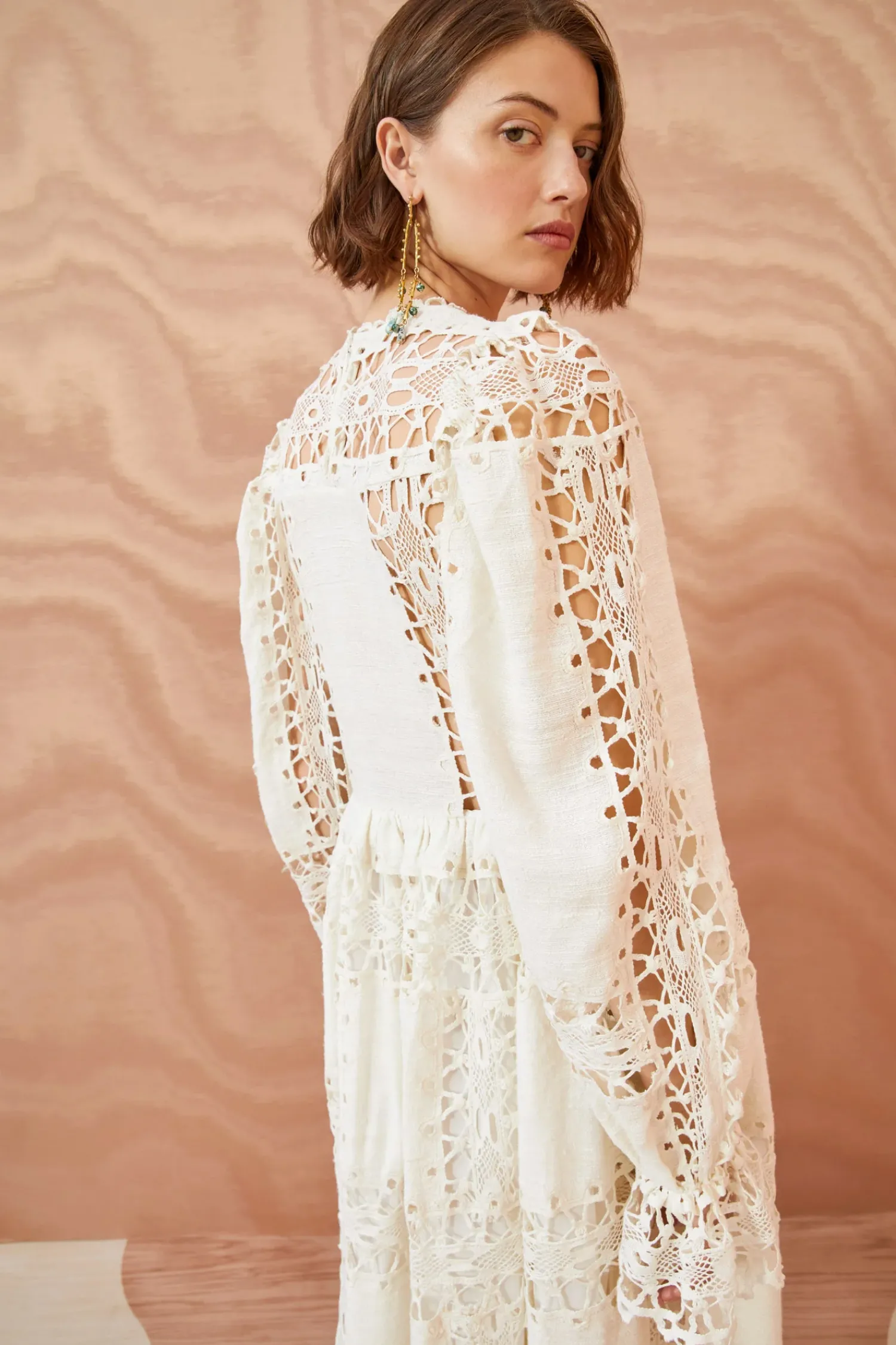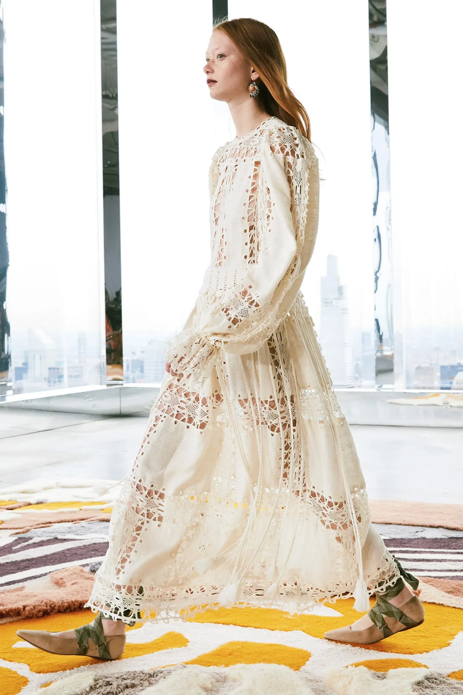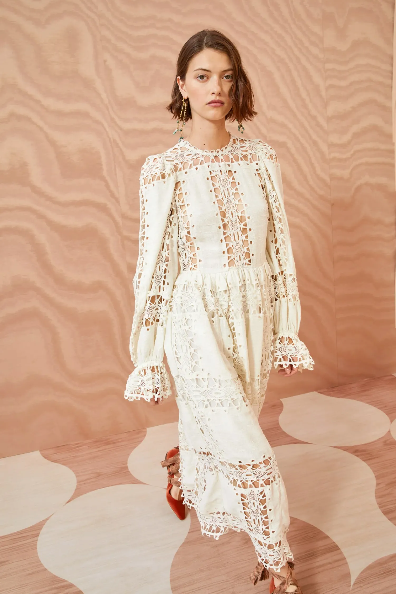 As Featured In Look 14 Of Our Autumn/Winter ’23 Runway Show, The Sonali Gown Is Made From Gorgeous Patchworked Engineered Lace And Hand-Loomed Silk Khadi Fabric. The Exaggerated Openwork Plays With Sheerness And Opacity, Revealing The Body Underneath To Create A Soft Geometric Effect. This Midi-Length Dress Features Long Sleeves With Exaggerated Cuffs, A Fixed Waistband, And A Hidden Side-Seam Zipper.