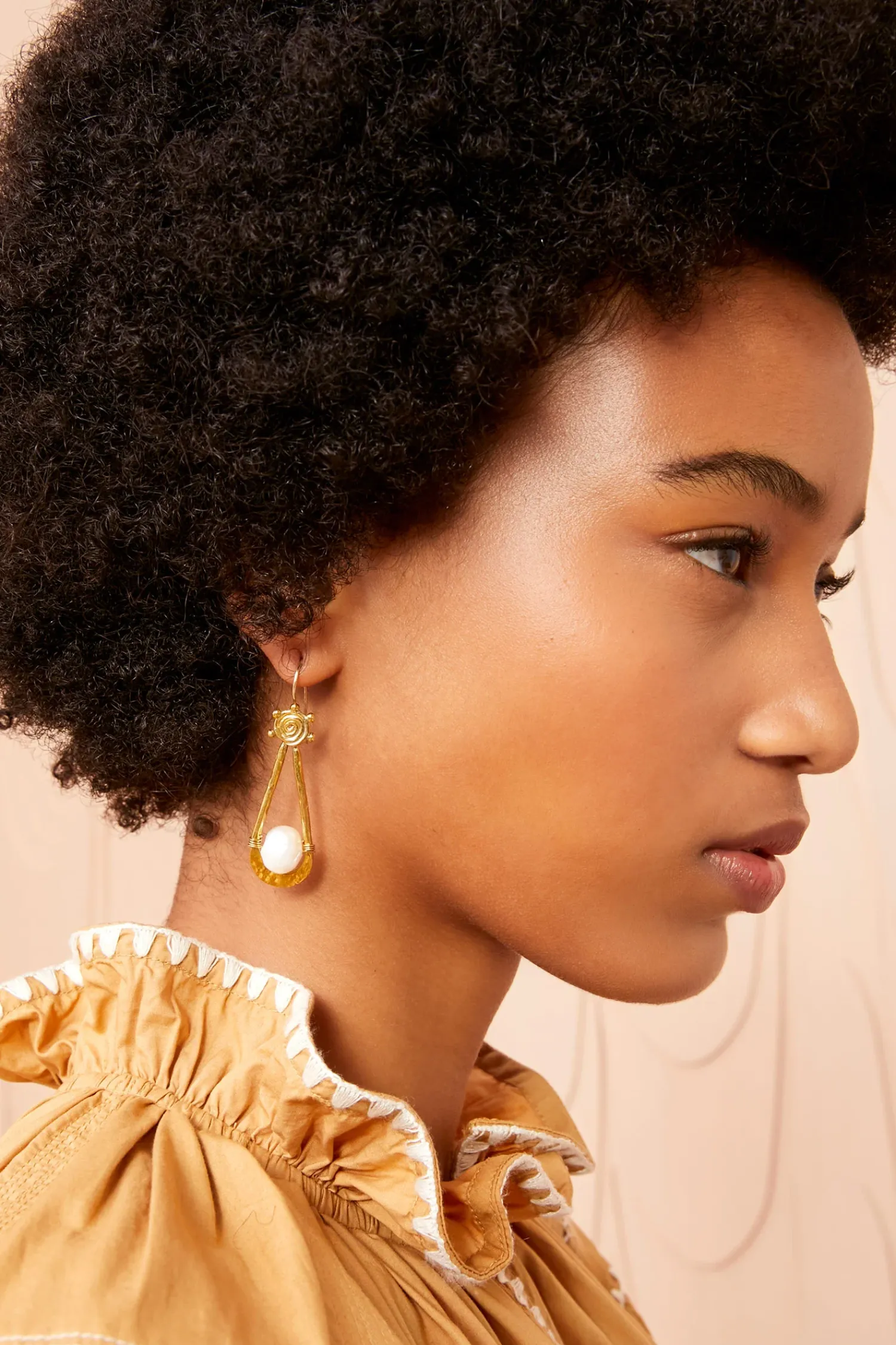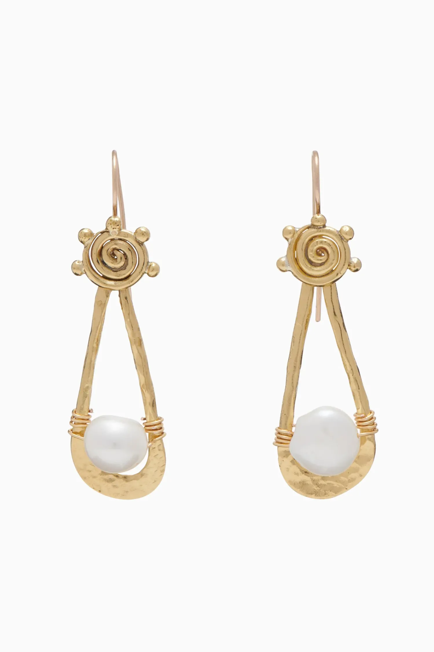 The Spiral Drop Stone Earring Is Hand-Hammered From Recycled Brass With A Spiral Motif Inspired By Ancient Craft Techniques And Is Strewn With A Luminous Freshwater Pearl. All Of Our Jewelry Is Masterfully Handcrafted By Our Long-Term Artisan Partners In Nairobi, Kenya, So Each One Is Unique. It Fastens With A Gold Wire Hook.