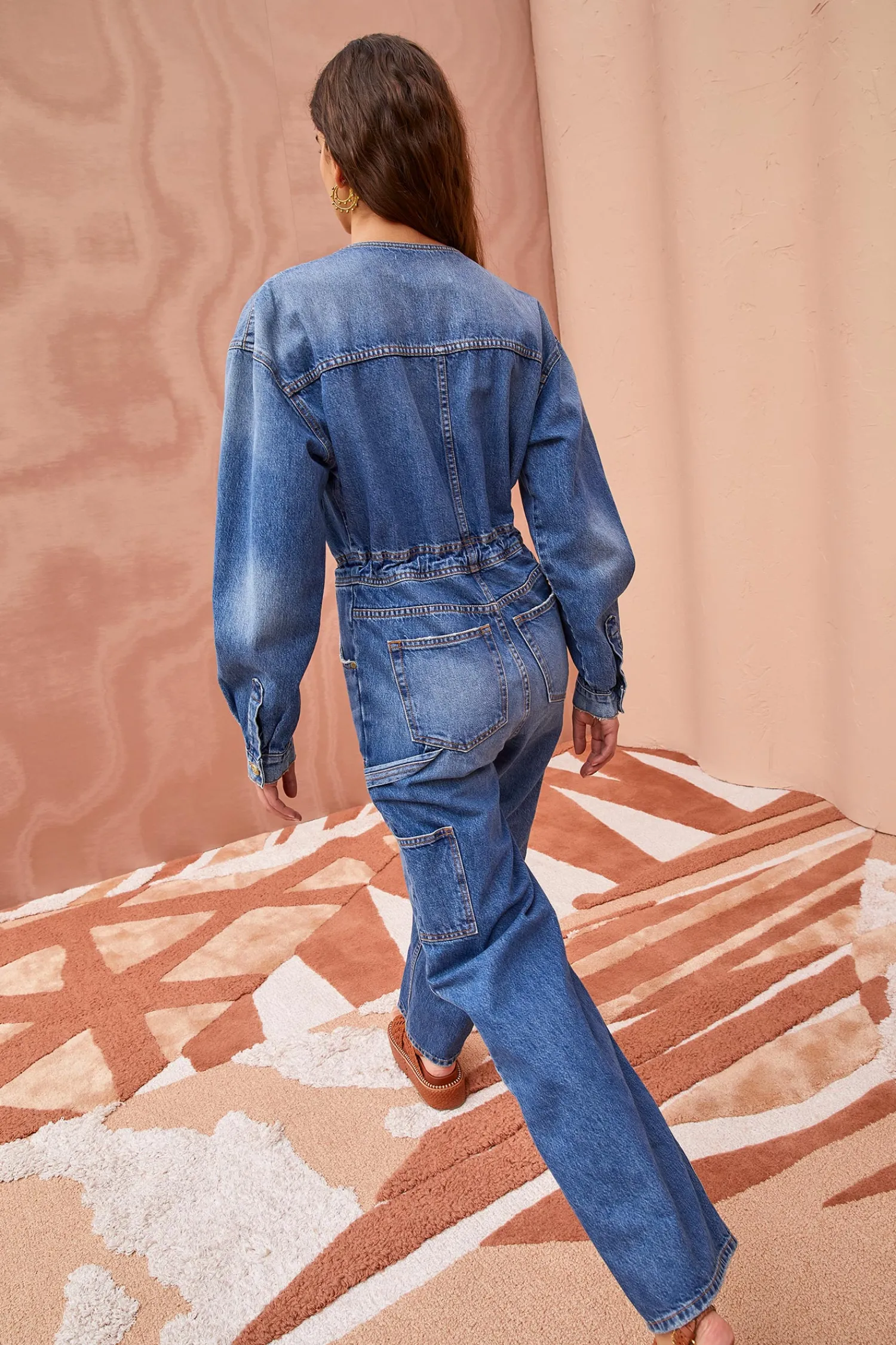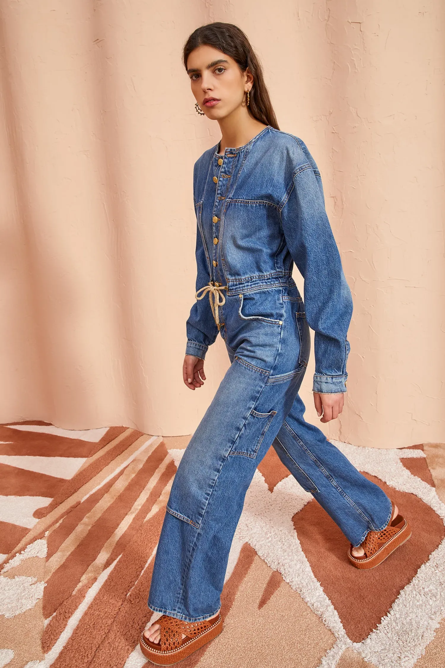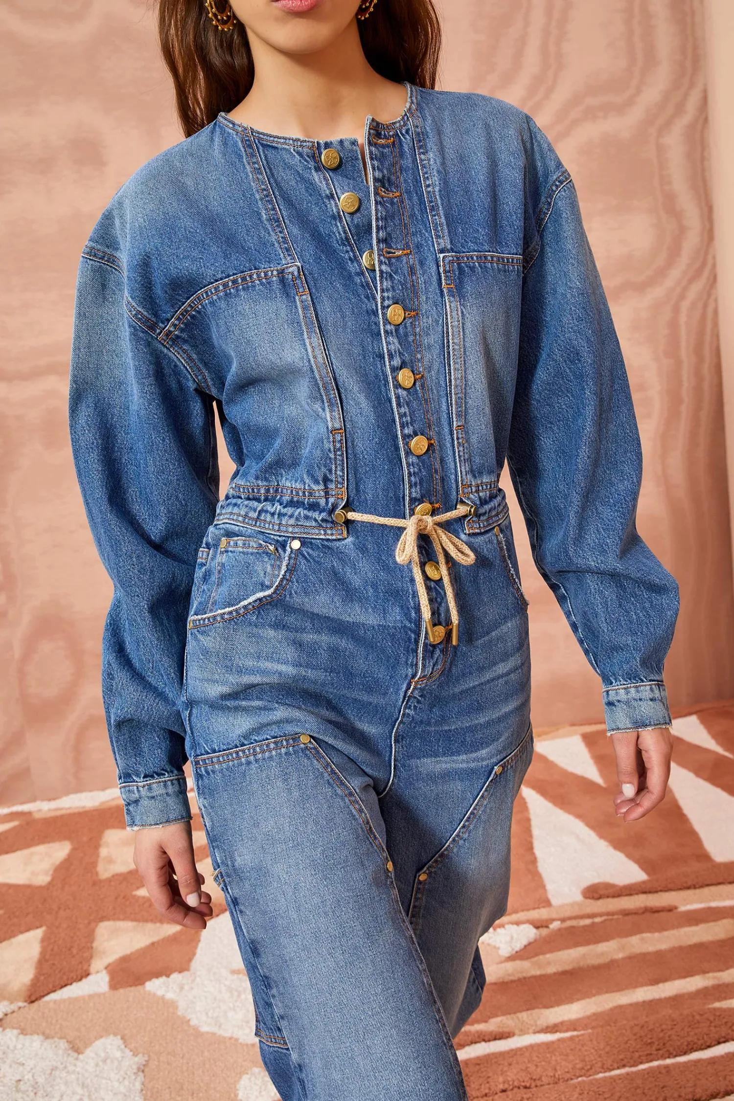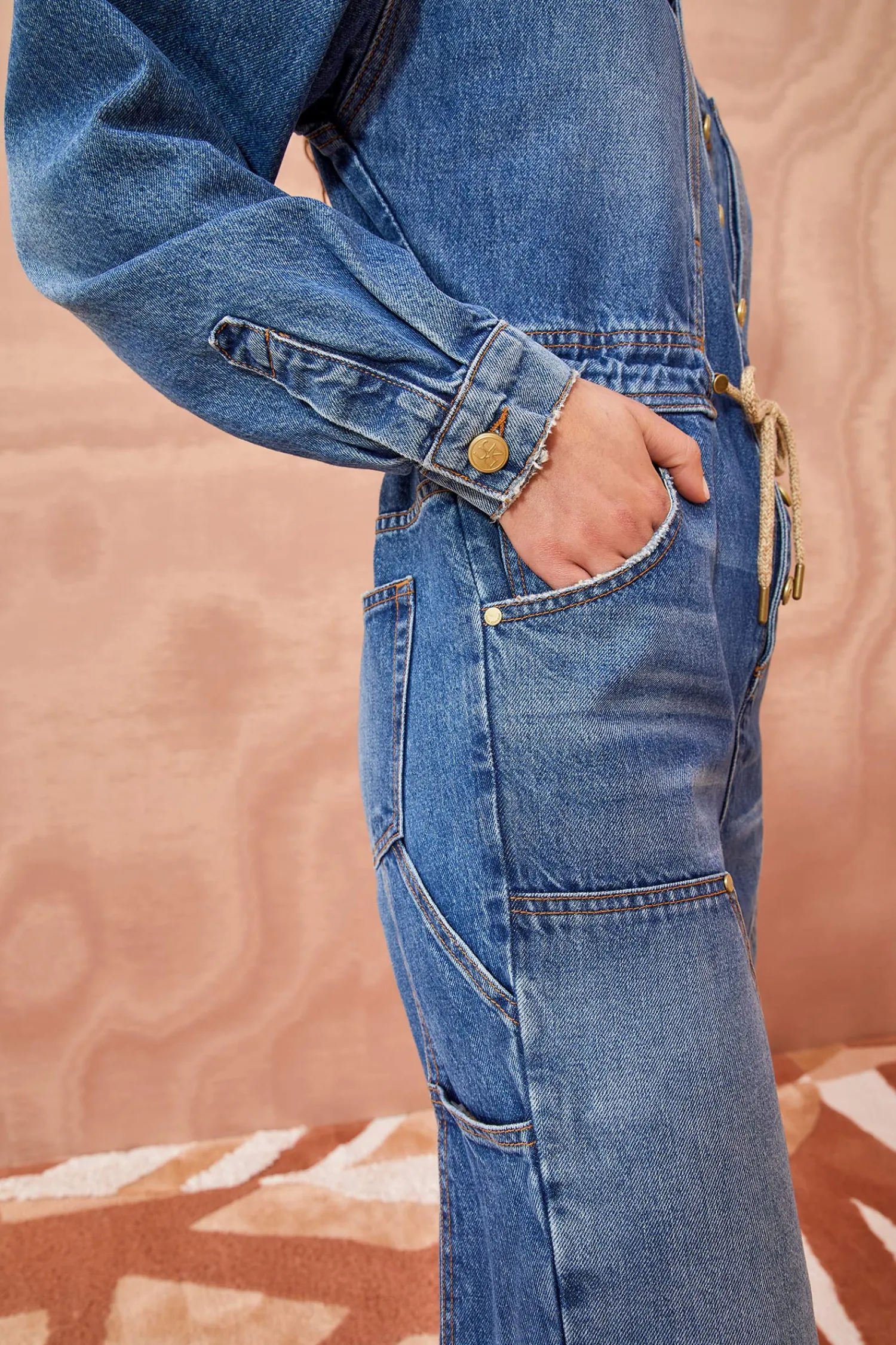 The Stevie Jumpsuit Is Our Exciting New Denim One-Piece, Crafted From Our Signature Handmade Denim In A Medium Blue Wash. This Everyday, Carpenter-Style Jumpsuit Features A Wide Leg Silhouette, Long Sleeves, A Gold Button-Down Front And Button Closures On The Cuffs Of The Sleeves. Adorned With Workwear Patches On The Leg And Finished With A Drawstring Tie.