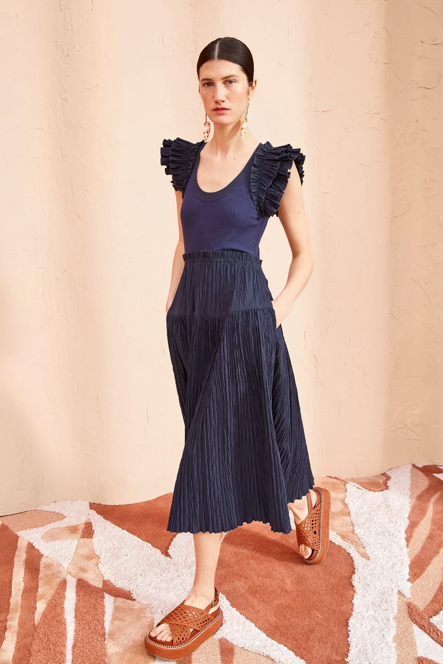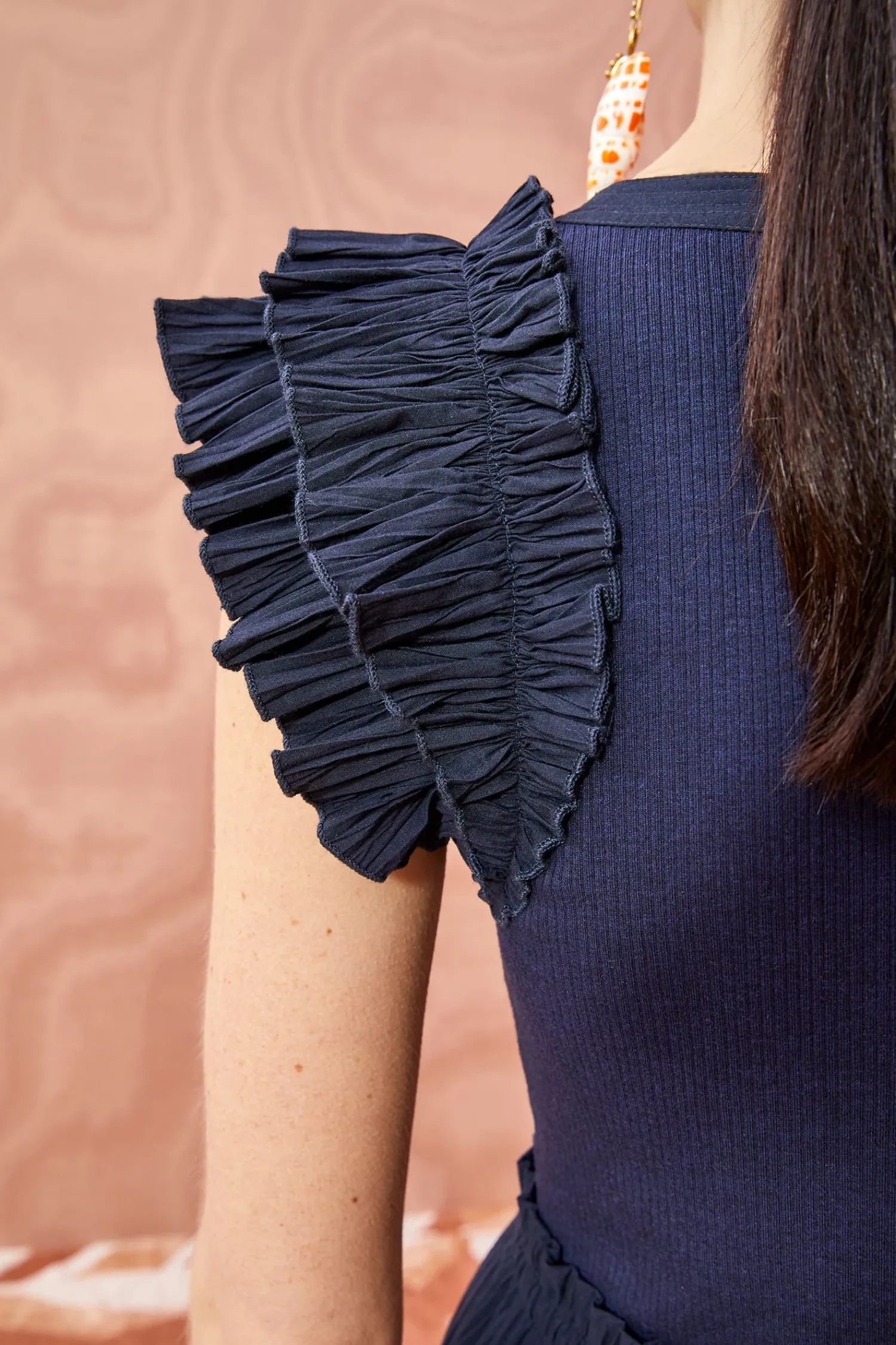 Our Virginia Dress Is Created By Mixing Two Sumptuous Fabrics Together. Its Body-Skimming Bodice Is Crafted From Our Ultra-Fine Ribbed Knit, And The Skirt Is Made From Our Signature Pleated Poplin, Designed With Three Tiers That Fall Into A Full, Floaty Skirt. This Stunning Navy Midi Dress Has Soft Poplin Flutter Sleeves That Are Layered To Create Subtle Drama At Each Shoulder, And A Round Neckline. Finished With Side-Seam Pockets.