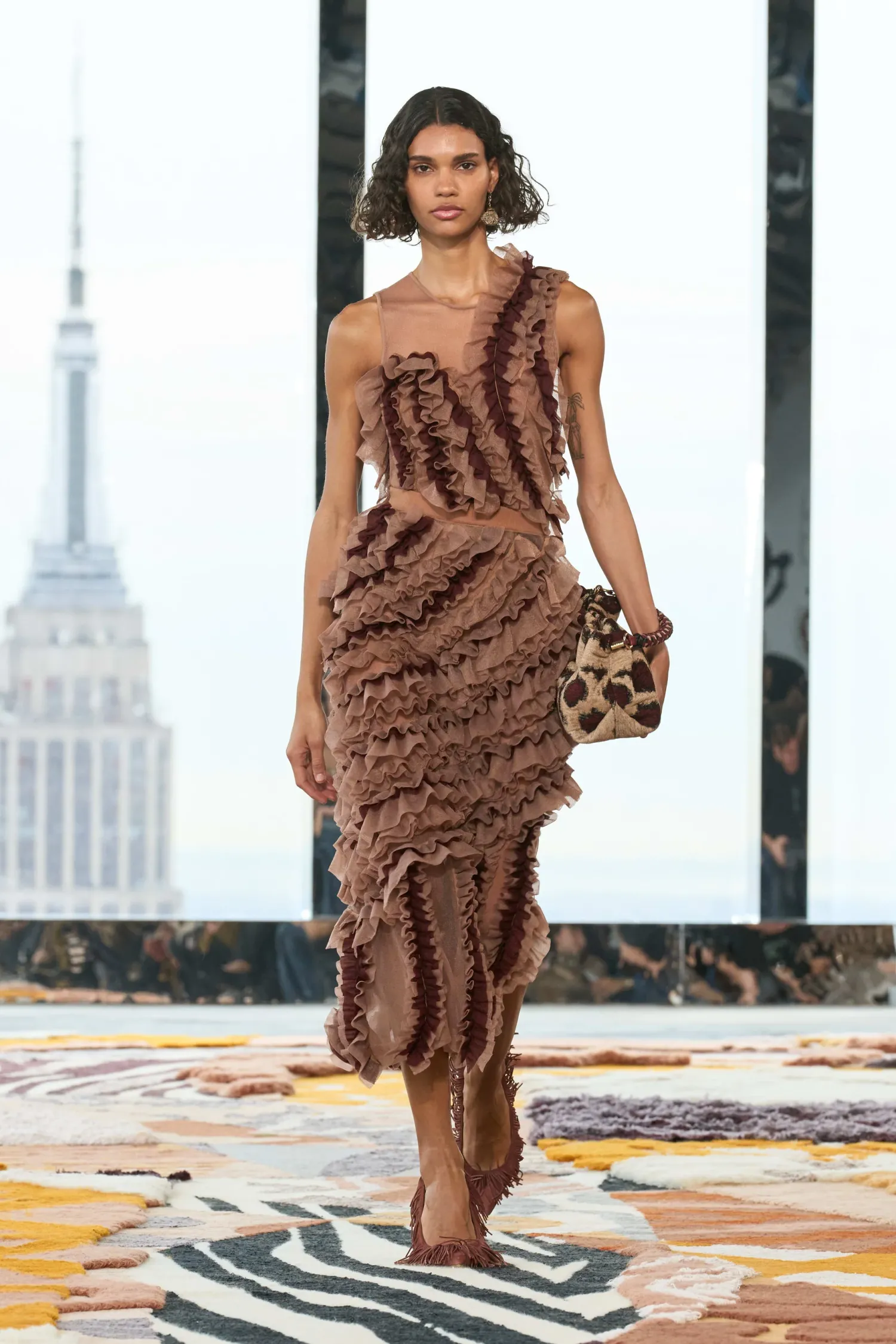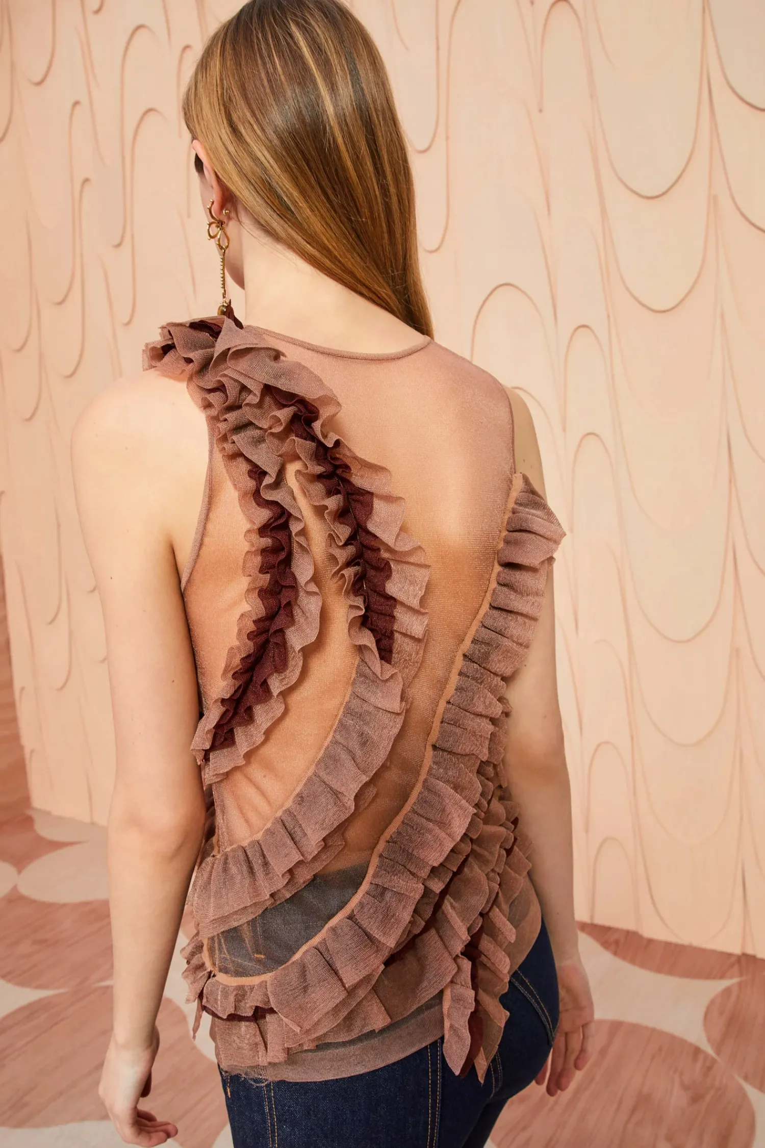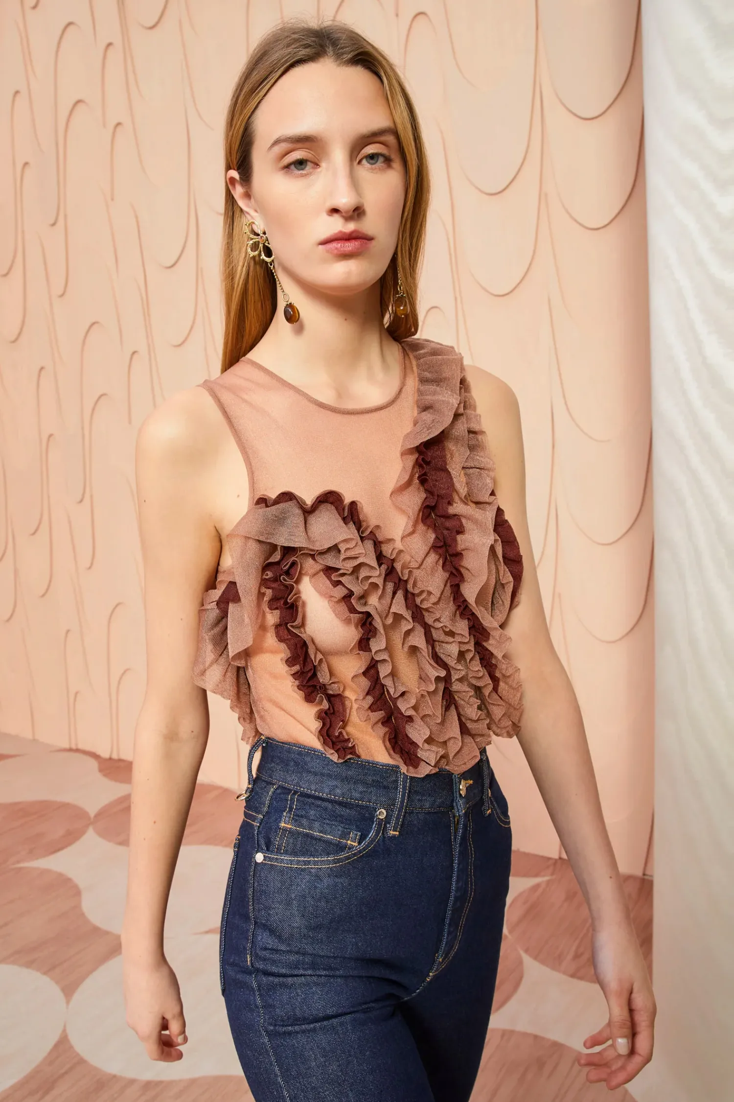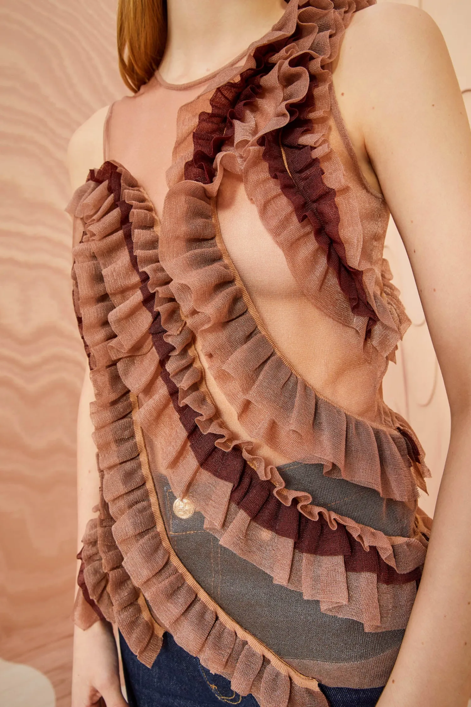 As Featured In Look 49 Of Our Autumn/Winter ’23 Runway Show, The Winnifred Top Is Made From Our Translucent Frills Knit, A Sheer Light Brown Top Adorned With A Strategically Placed Explosion Of Fluttering Frills Across The Bodice. Pair This Sleeveless Top With The Sarafina Skirt For The Full Look.