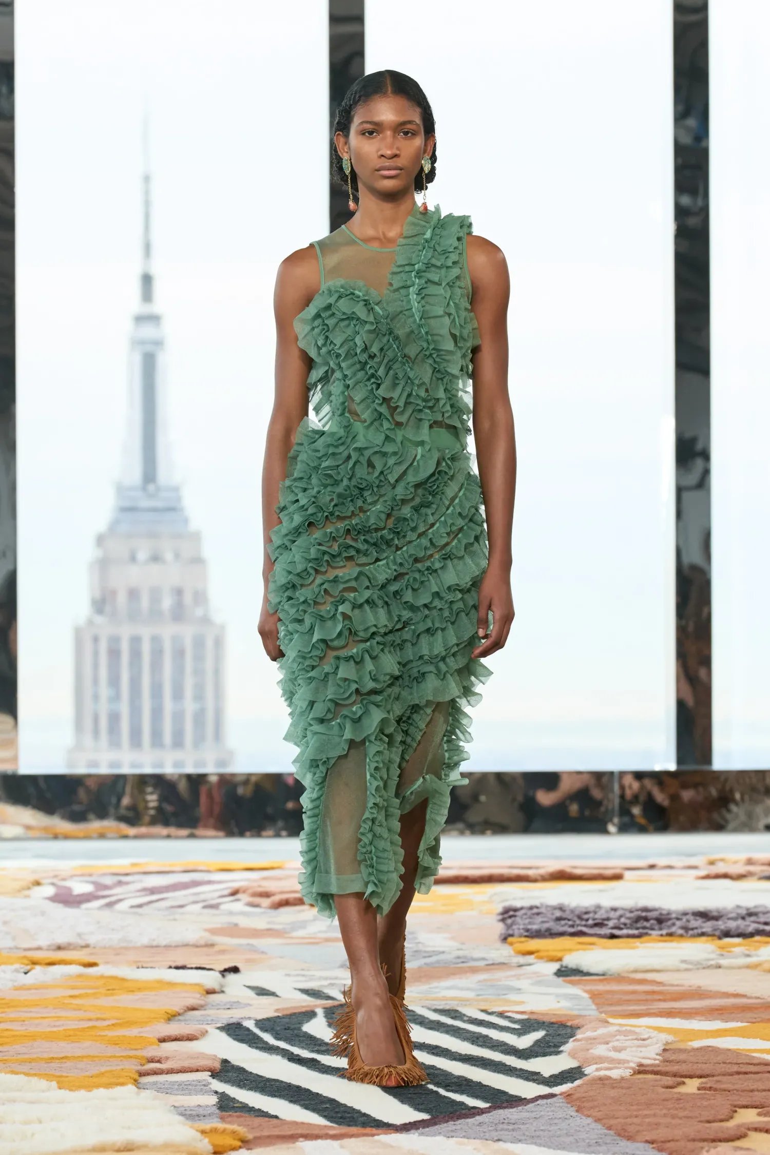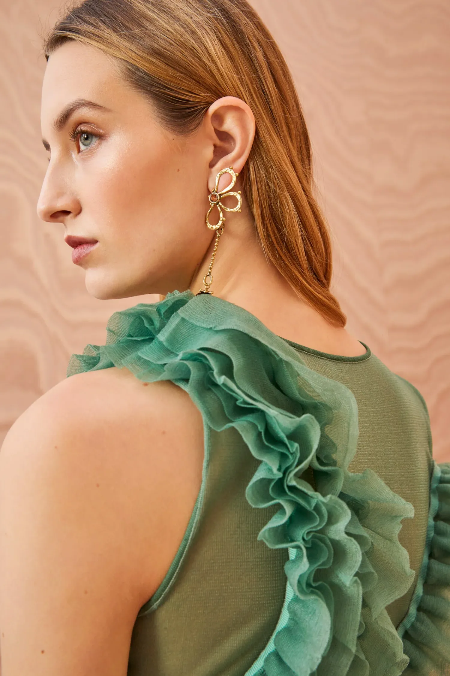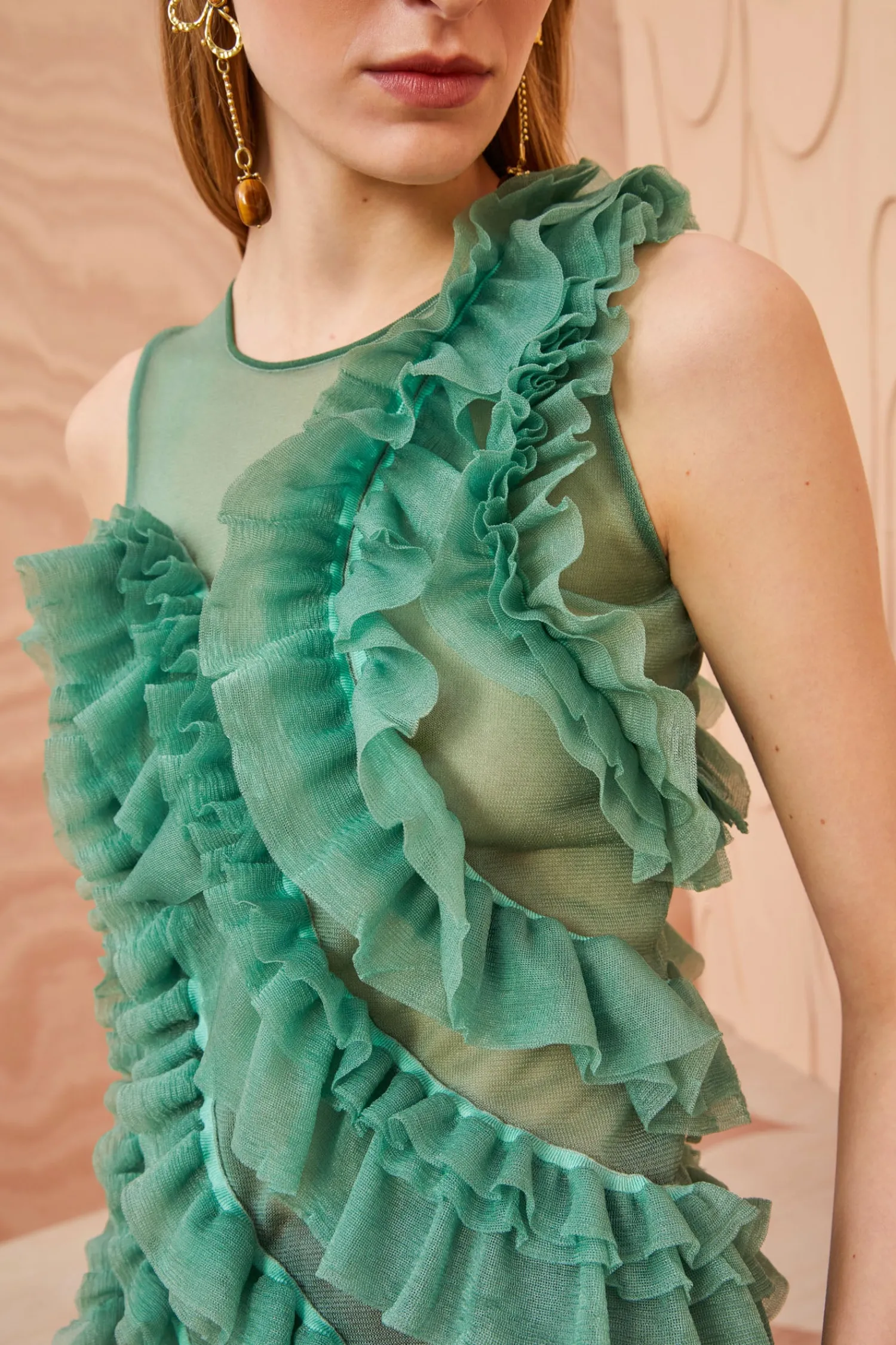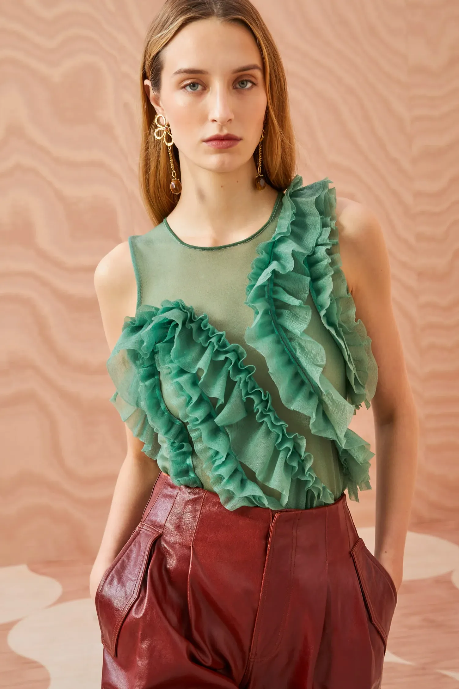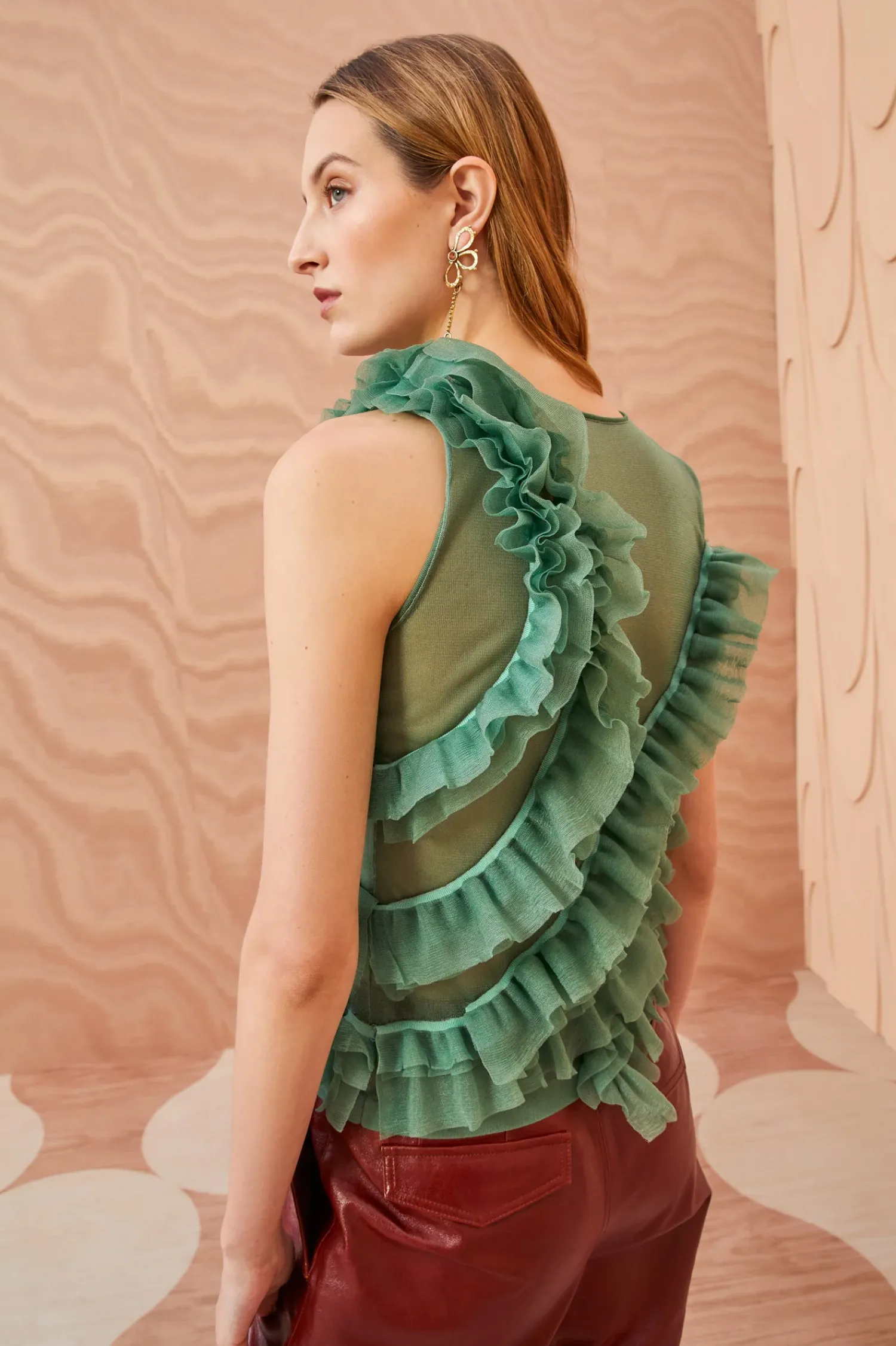 As Featured In Look 2 Of Our Autumn/Winter ’23 Runway Show, Our Winnifred Top Is A Joyous Explosion Of Ruffles–A Translucent Knit Is Transformed Into A Sheer Silhouette, While Delicate Frills Are Applied On Top. This Sleeveless Top Has A Crewneck And Is A Delightful Jade Green.