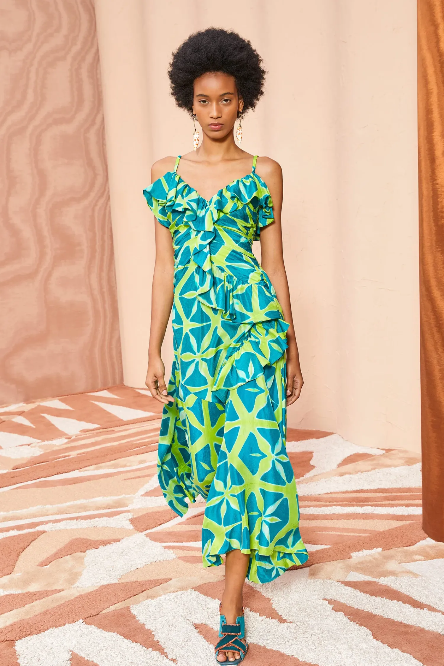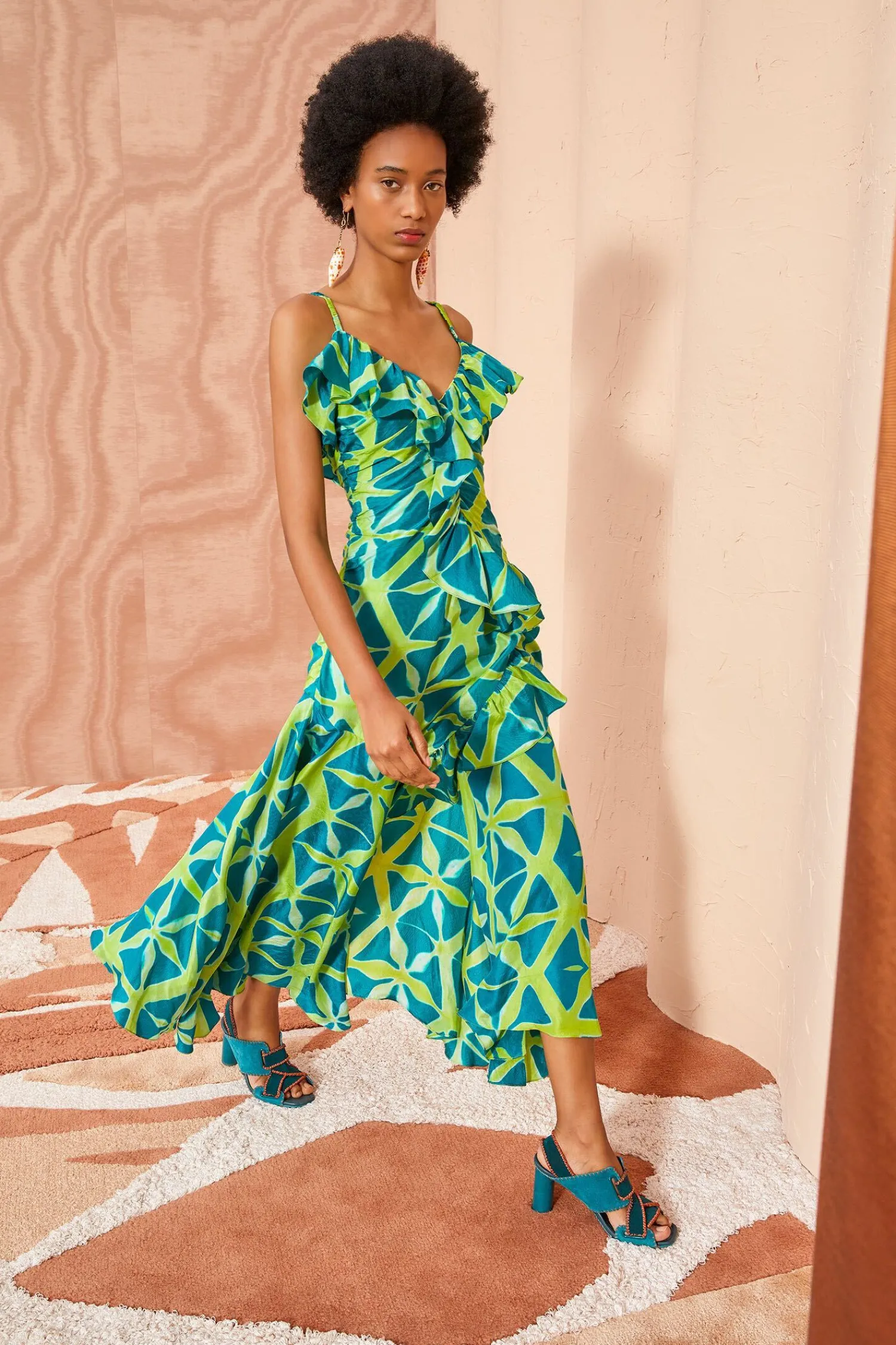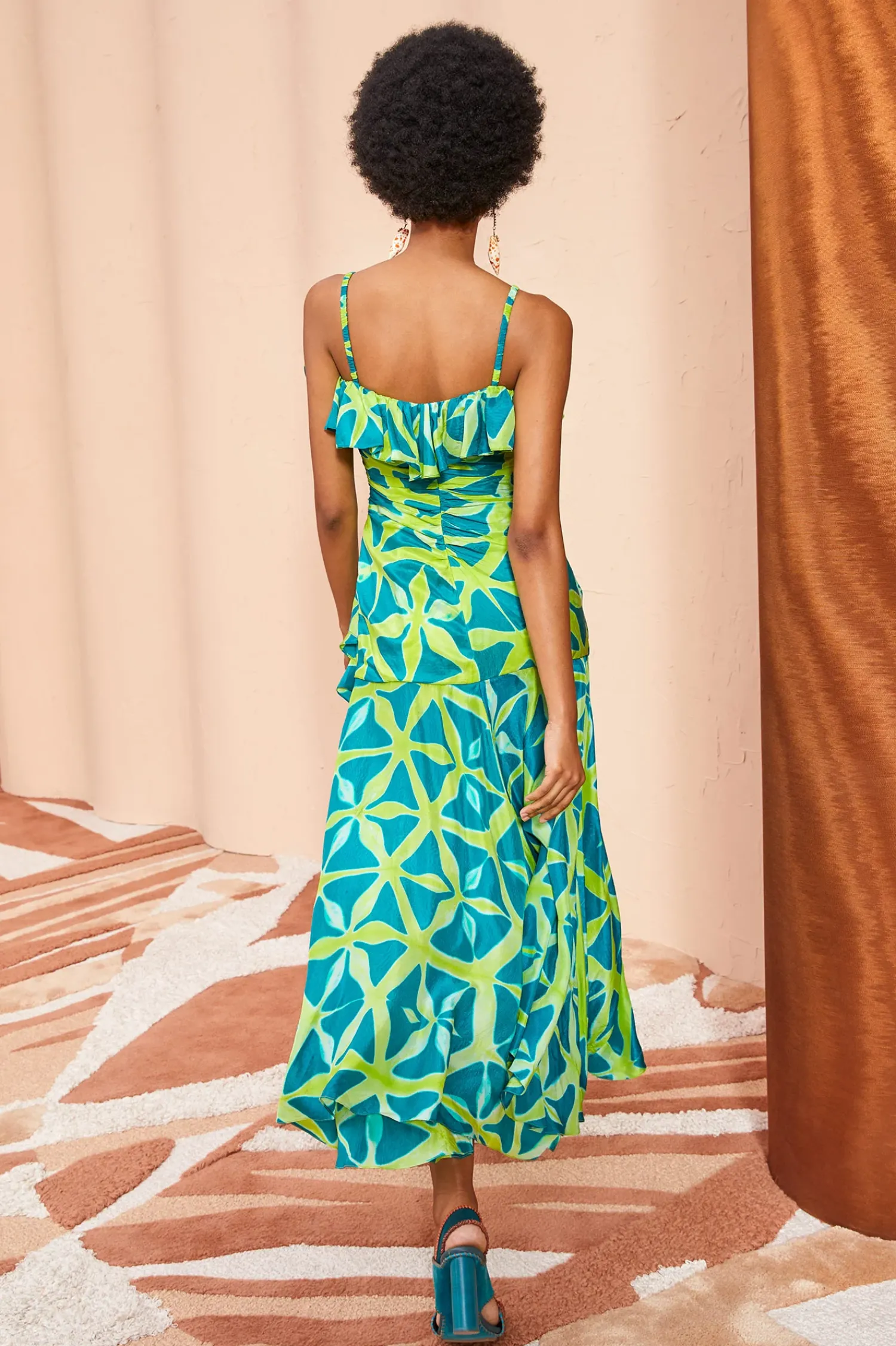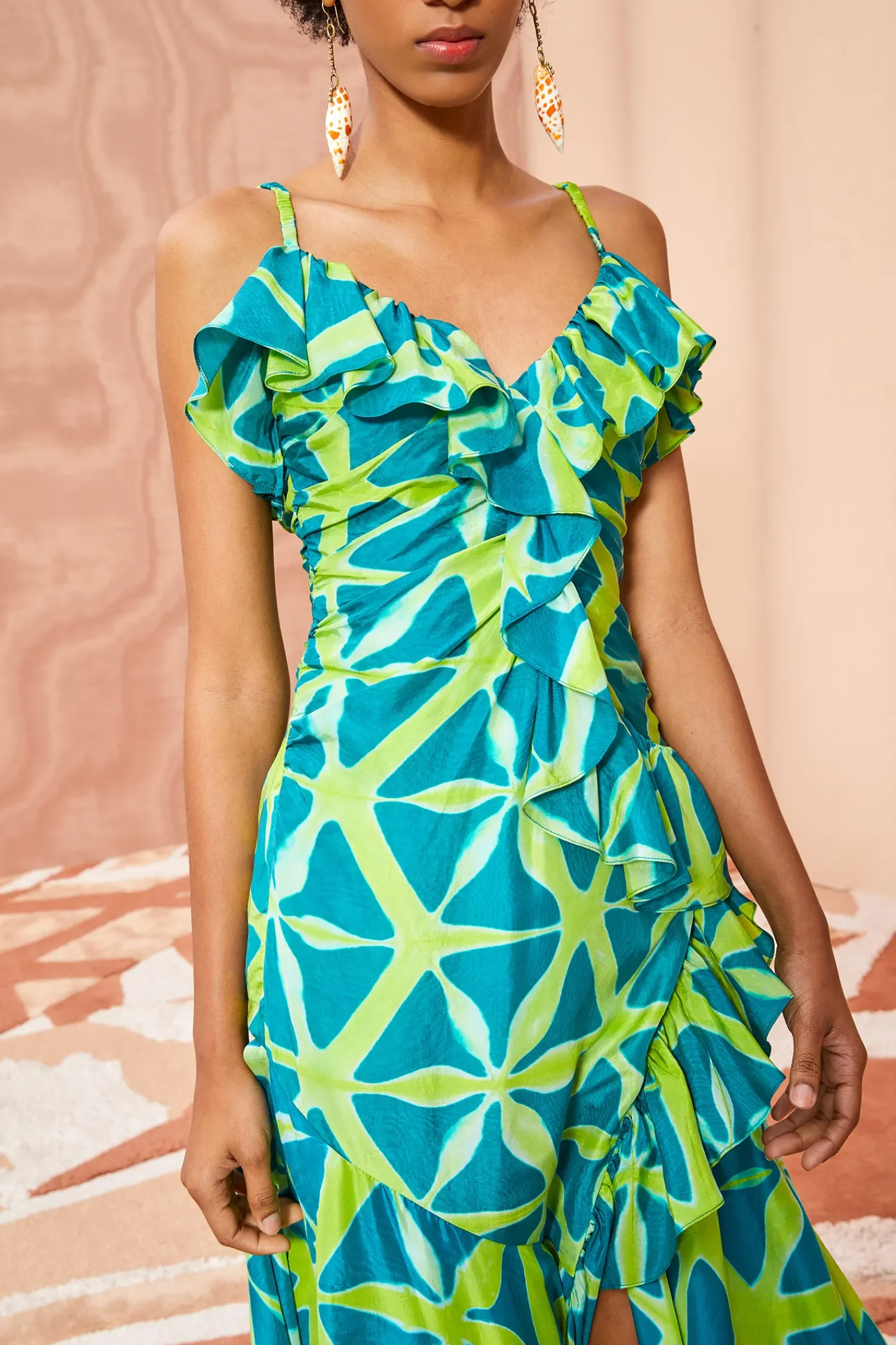 As Featured In Look 34 Of Our Pre-Fall ’23 Lookbook, The Zoya Dress Is Handcrafted By A Collective Of Women In Bangalore Using An Intricate Technique Known As Clamp Dyeing That Creates Beautifully Prismatic Patterns In Vibrant Blue And Green Hues. No Two Pieces Are Alike. This Exquisite Midi Dress Has A Ruched Bodice Detailed With Ruffles Along The Neckline That Cascade Into The Skirt. It Is Finished With A Side-Seam Zipper Closure.